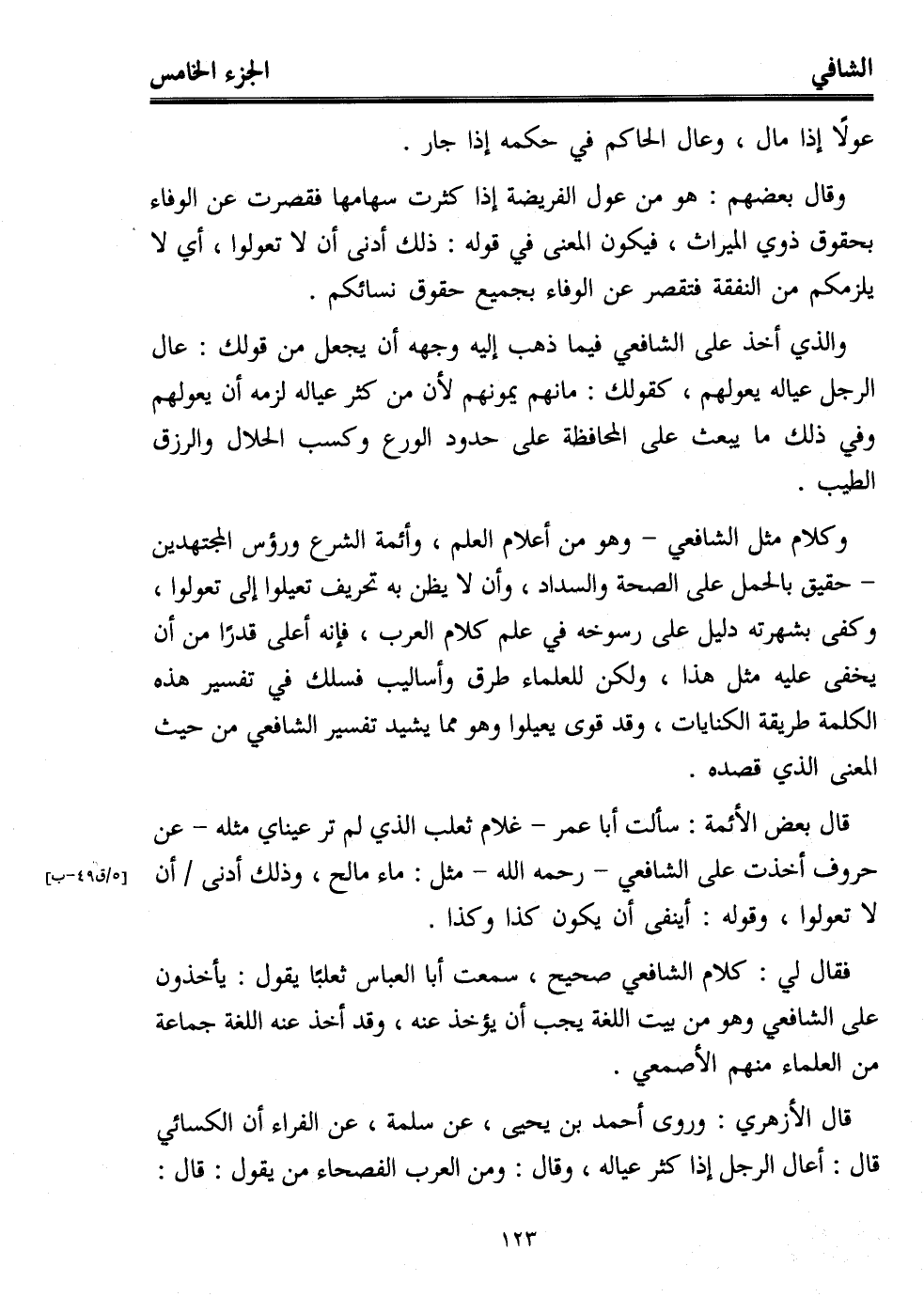 والذي أخذ على الشافعي فيما ذهب إليه وجهه أن يجعل من قولك: عال الرجل عياله يعولهم، كقولك: مانهم يمونهم لأن من كثر عياله لزمه أن يعولهم وفي ذلك ما يبعث على المحافظة على حدود الورع وكسب الحلال والرزق الطيب.