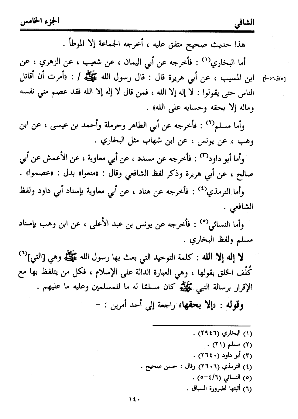 أما البخاري (¬1): فأخرجه عن أبي اليمان، عن شعيب، عن الزهري، عن ابن المسيب، عن أبي هريرة قال: قال رسول الله - صلى الله عليه وسلم -: "أمرت أن أقاتل الناس حتى يقولوا: لا إله إلا الله، فمن قال لا إله إلا الله فقد عصم مني نفسه وماله إلا بحقه وحسابه على الله".
