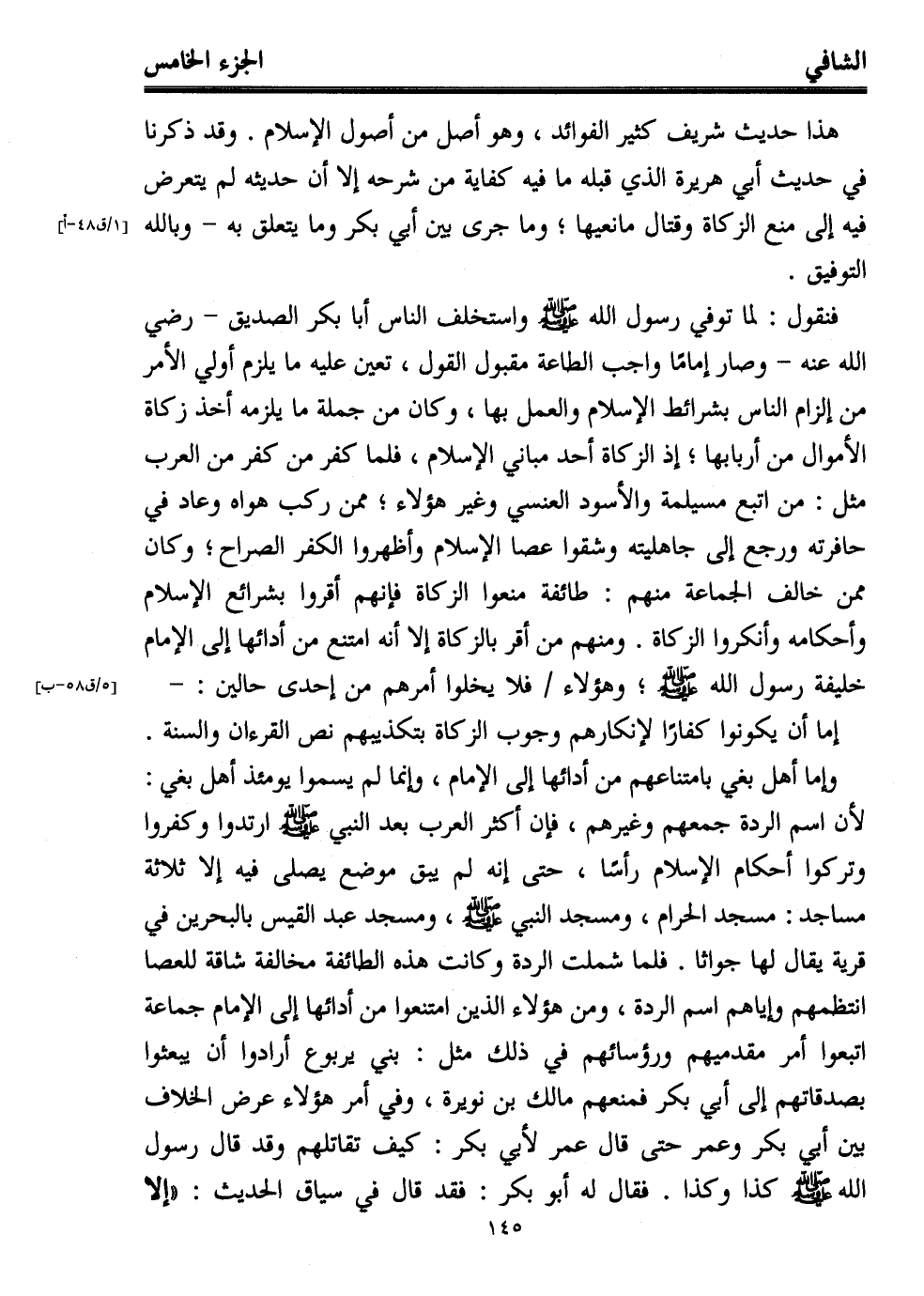 وإما أهل بغي بامتناعهم من أدائها إلى الإمام، وإنما لم يسموا يومئذ أهل بغي: لأن اسم الردة جمعهم وغيرهم، فإن أكثر العرب بعد النبي - صلى الله عليه وسلم - ارتدوا وكفروا وتركوا أحكام الإسلام رأسًا، حتى إنه لم يبق موضع يصلى فيه إلا ثلاثة مساجد: مسجد الحرام، ومسجد النبي - صلى الله عليه وسلم - , ومسجد عبد القيس بالبحرين في قرية يقال لها جواثا. فلما شملت الردة وكانت هذه الطائفة مخالفة شاقة للعصا انتظمهم وإياهم اسم الردة، ومن هؤلاء الذين امتنعوا من أدائها إلى الإمام جماعة اتبعوا أمر مقدميهم ورؤسائهم في ذلك مثل: بني يربوع أرادوا أن يبعثوا بصدقاتهم إلى أبي بكر فمنعهم مالك بن نويرة، وفي أمر هؤلاء عرض الخلاف بين أبي بكر وعمر حتى قال عمر لأبي بكر: كيف تقاتلهم وقد قال رسول الله - صلى الله عليه وسلم - كذا وكذا. فقال له أبو بكر: فقد قال في سياق الحديث: "إلا