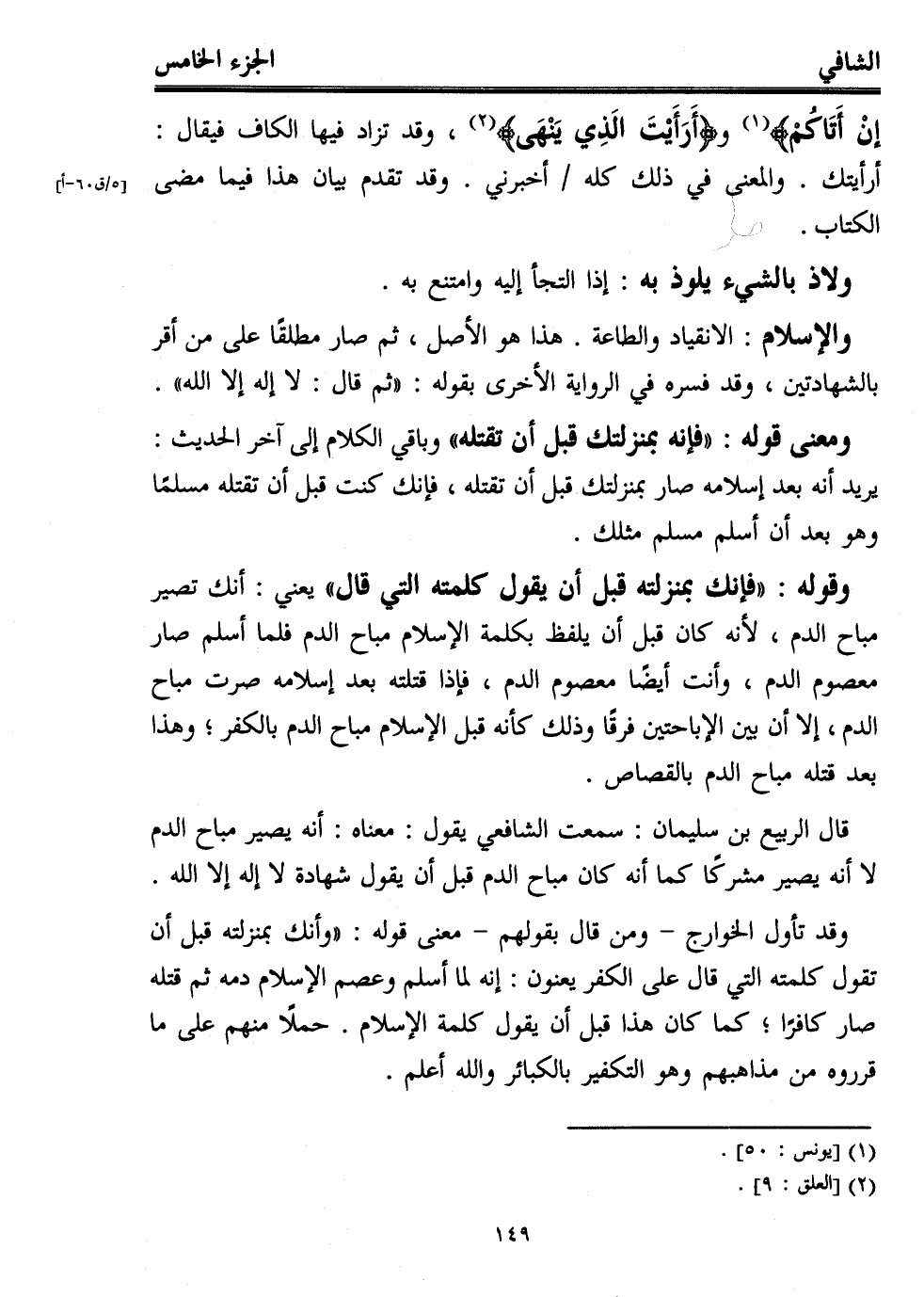 قال الربيع بن سليمان: سمعت الشافعي يقول: معناه: أنه يصير مباح الدم لا أنه يصير مشركًا كما أنه كان مباح الدم قبل أن يقول شهادة لا إله إلا الله.