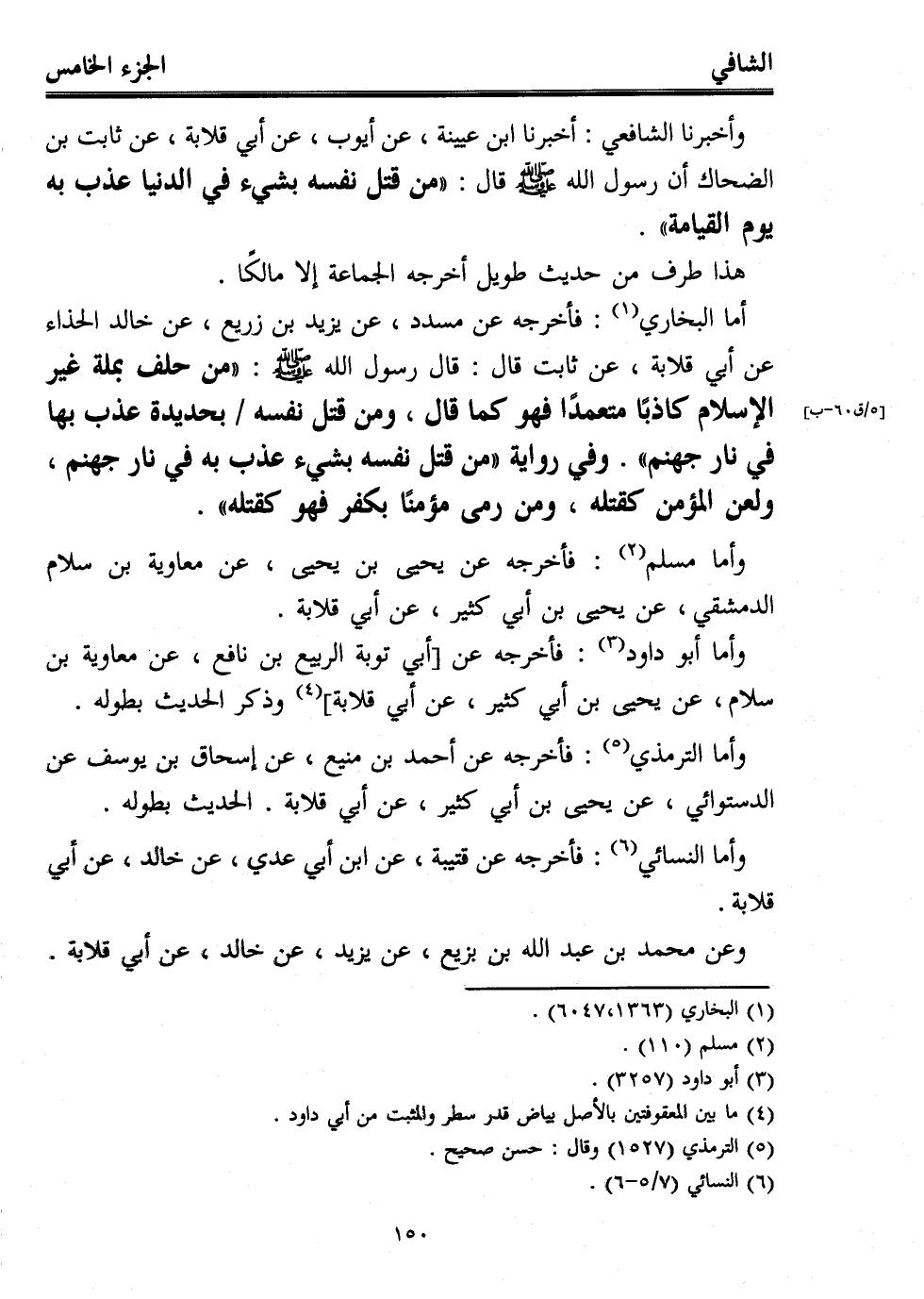 أما البخاري (¬1): فأخرجه عن مسدد، عن يزيد بن زريع، عن خالد الحذاء عن أبي قلابة، عن ثابت قال: قال رسول الله - صلى الله عليه وسلم -: "من حلف بملة غير الإِسلام كاذبًا متعمدًا فهو كما قال، ومن قتل نفسه بحديدة عذب بها في نار جهنم". وفي رواية "من قتل نفسه بشيء عذب به في نار جهنم، ولعن المؤمن كقتله، ومن رمى مؤمنًا بكفر فهو كقتله".