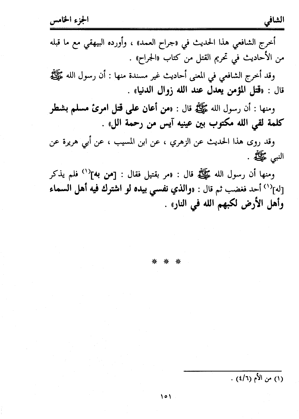 وقد أخرج الشافعي في المعنى أحاديث غير مسندة منها: أن رسول الله - صلى الله عليه وسلم - قال: "قتل المؤمن يعدل عند الله زوال الدنيا".