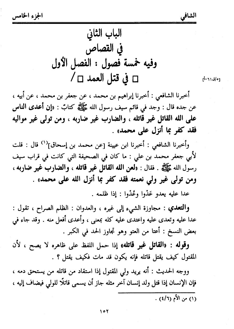 وأخبرنا الشافعي: أخبرنا ابن عيينة [عن محمد بن إسحاق] (¬1) قال: قلت لأبي جعفر محمد بن علي: ما كان في الصحيفة التي كانت في قراب سيف رسول الله - صلى الله عليه وسلم -. فقال: "لعن الله القاتل غير قاتله، والضارب غير ضاربه، ومن تولى غير ولي نعمته فقد كفر بما أنزل الله على محمد".