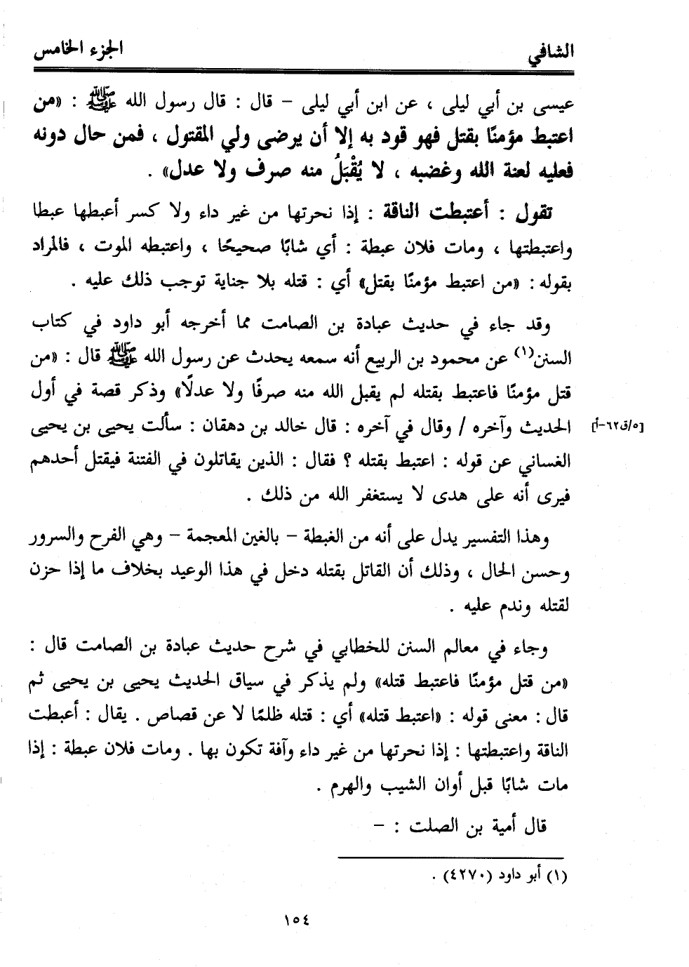 وقد جاء في حديث عبادة بن الصامت مما أخرجه أبو داود في كتاب السنن (¬1) عن محمود بن الربيع أنه سمعه يحدث عن رسول الله - صلى الله عليه وسلم - قال: "من قتل مؤمنًا فاعتبط بقتله لم يقبل الله منه صرفًا ولا عدلاً" وذكر قصة في أول الحديث وآخره وقال في آخره: قال خالد بن دهقان: سألت يحيى بن يحيى الغساني عن قوله: اعتبط بقتله؟ فقال: الذين يقاتلون في الفتنة فيقتل أحدهم فيرى أنه على هدى لا يستغفر الله من ذلك.