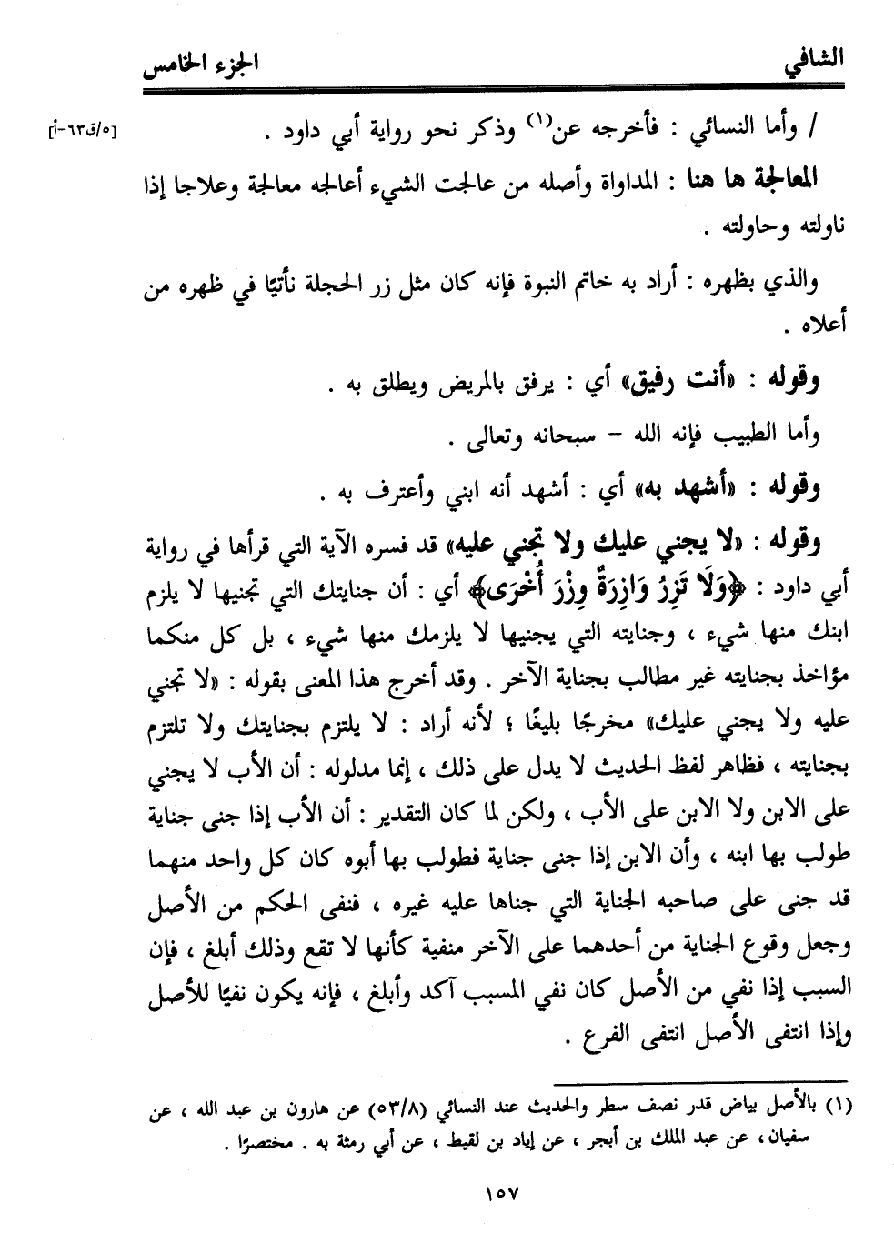 وقوله: "لا يجني عليك ولا تجني عليه" قد فسره الآية التي قرأها في رواية أبي داود: {تَزِرُ وَازِرَةٌ وِزْرَ أُخْرَى} أي: أن جنايتك التي تجنيها لا يلزم ابنك منها شيء، وجنايته التي يجنيها لا يلزمك منها شيء، بل كل منكما مؤاخذ بجنايته غير مطالب بجناية الآخر. وقد أخرج هذا المعنى بقوله: "لا تجني عليه ولا يجني عليك" مخرجًا بليغًا؛ لأنه أراد: لا يلتزم بجنايتك ولا تلتزم بجنايته، فظاهر لفظ الحديث لا يدل على ذلك، إنما مدلوله: أن الأب لا يجني على الابن ولا الابن على الأب، ولكن لما كان التقدير: أن الأب إذا جنى جناية طولب بها ابنه، وأن الابن إذا جنى جناية فطولب بها أبوه كان كل واحد منهما قد جنى على صاحبه الجناية التي جناها عليه غيره، فنفى الحكم من الأصل وجعل وقوع الجناية من أحدهما على الآخر منفية كأنها لا تقع وذلك أبلغ، فإن السبب إذا نفي من الأصل كان نفي المسبب آكد وأبلغ، فإنه يكون نفيًا للأصل وإذا انتفى الأصل انتفى الفرع.