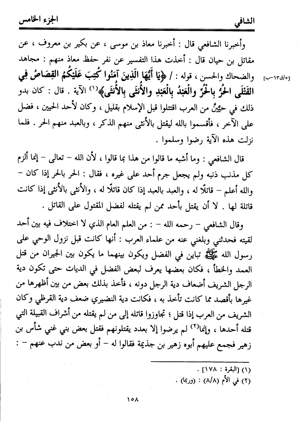 وأخبرنا الشافعي قال: أخبرنا معاذ بن موسى، عن بكير بن معروف، عن مقاتل بن حيان قال: أخذت هذا التفسير عن نفر حفظ معاذ منهم: مجاهد والضحاك والحسن، قوله: {يَا أَيُّهَا الَّذِينَ آمَنُوا كُتِبَ عَلَيْكُمُ الْقِصَاصُ في الْقَتْلَى الْحُرُّ بِالْحُرِّ وَالْعَبْدُ بِالْعَبْدِ وَالْأُنْثَى} (¬1) الآية. قال: كان بدو ذلك في حيَّينَّ من العرب اقتتلوا قبل الإسلام بقليل، وكان لأحد الحيين، فضل على الآخر، فأقسموا بالله ليقتل بالأنثى منهم الذكر، وبالعبد منهم الحر. فلما نزلت هذه الآية رضوا وسلموا.
