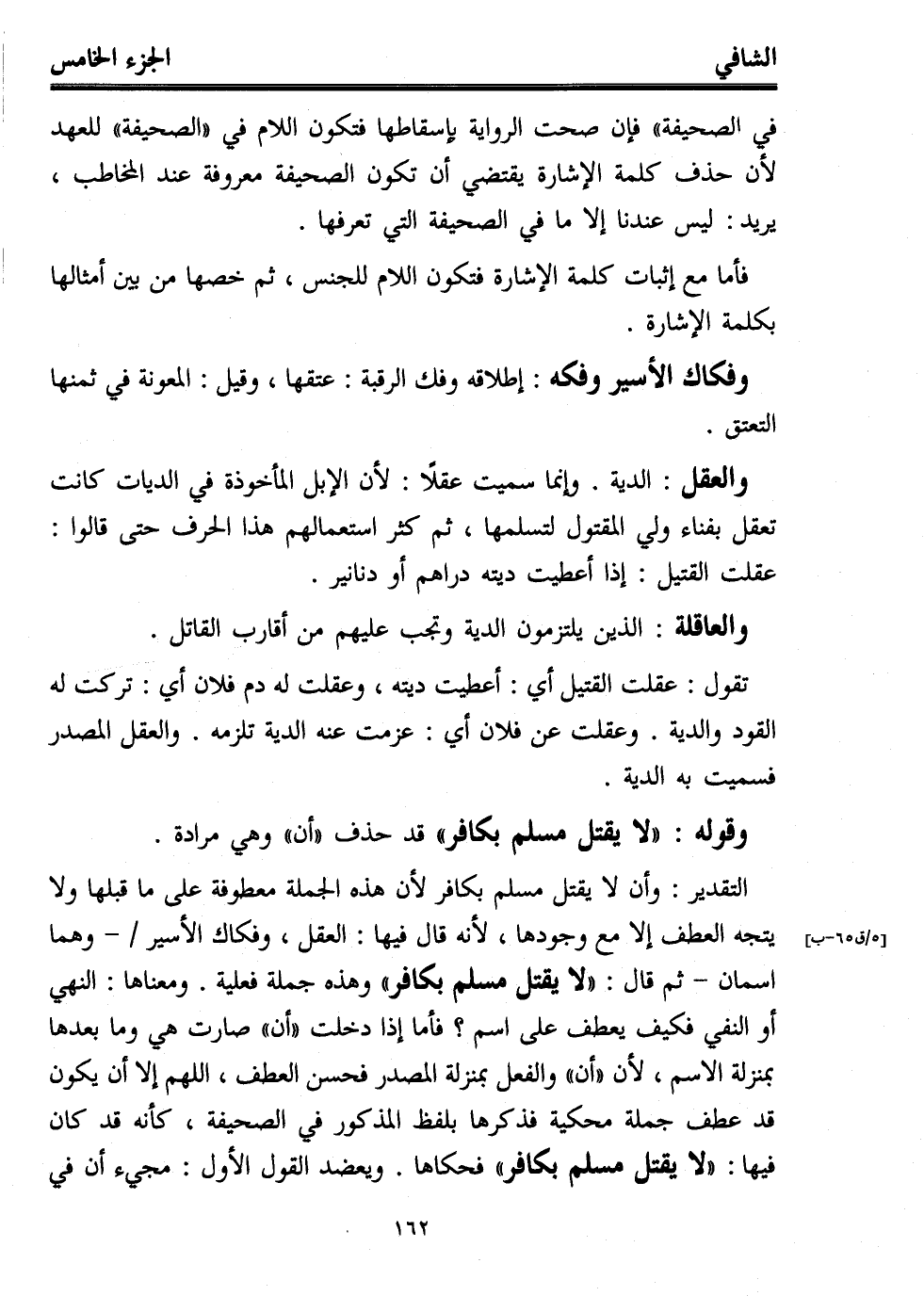 التقدير: وأن لا يقتل مسلم بكافر لأن هذه الجملة معطوفة على ما قبلها ولا يتجه العطف إلا مع وجودها، لأنه قال فيها: العقل، وفكاك الأسير -وهما اسمان- ثم قال: "لا يقتل مسلم بكافر" وهذه جملة فعلية. ومعناها: النهي أو النفي فكيف يعطف على اسم؟ فأما إذا دخلت "أن" صارت هي وما بعدها بمنزلة الاسم، لأن "أن" والفعل بمنزلة المصدر فحسن العطف، اللهم إلا أن يكون قد عطف جملة محكية فذكرها بلفظ المذكور في الصحيفة، كأنه قد كان فيها: "لا يقتل مسلم بكافر" فحكاها. ويعضد القول الأول: مجيء أن في