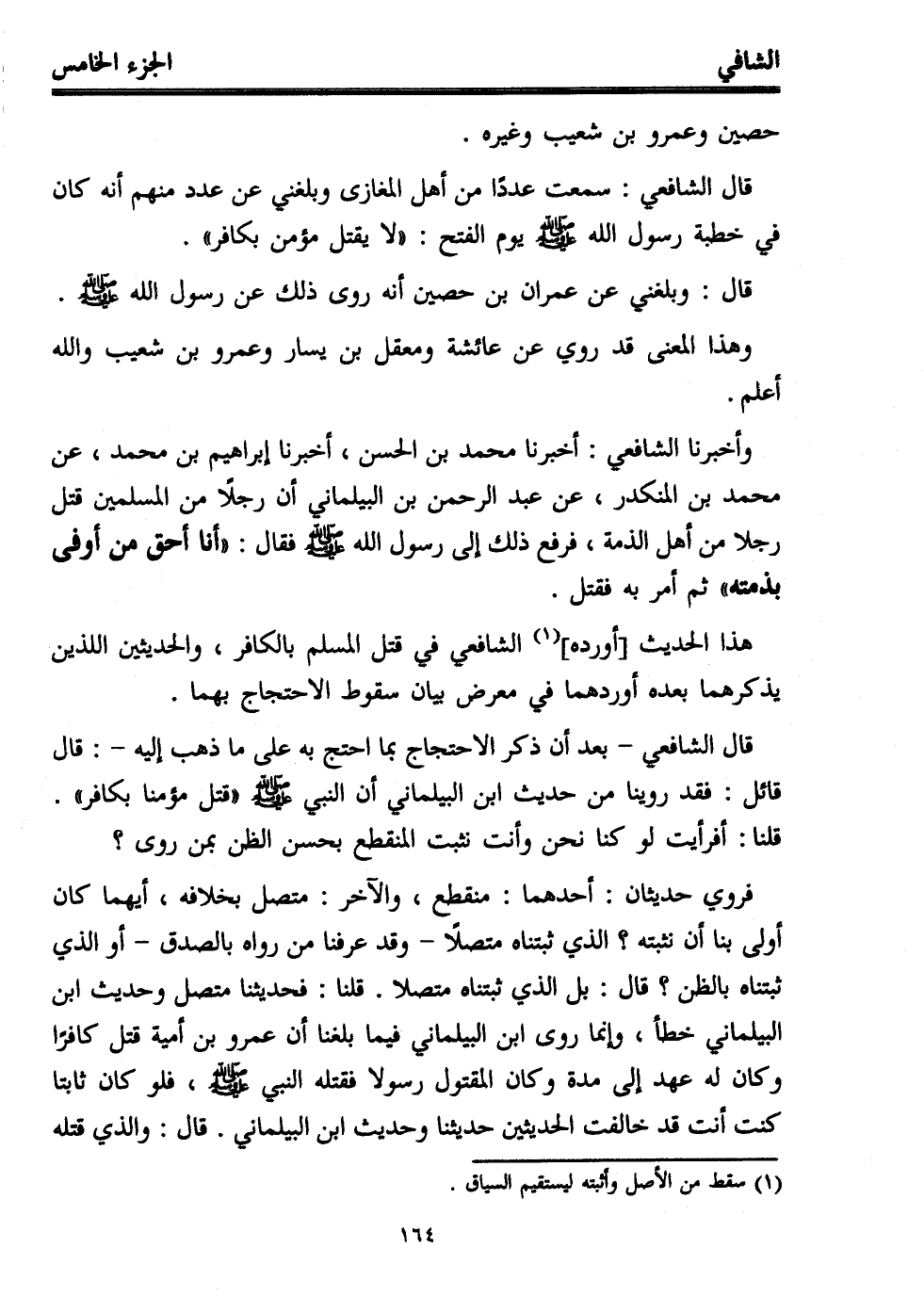 قال الشافعي: سمعت عددًا من أهل المغازى وبلغني عن عدد منهم أنه كان في خطبة رسول الله - صلى الله عليه وسلم - يوم الفتح: "لا يقتل مؤمن بكافر".