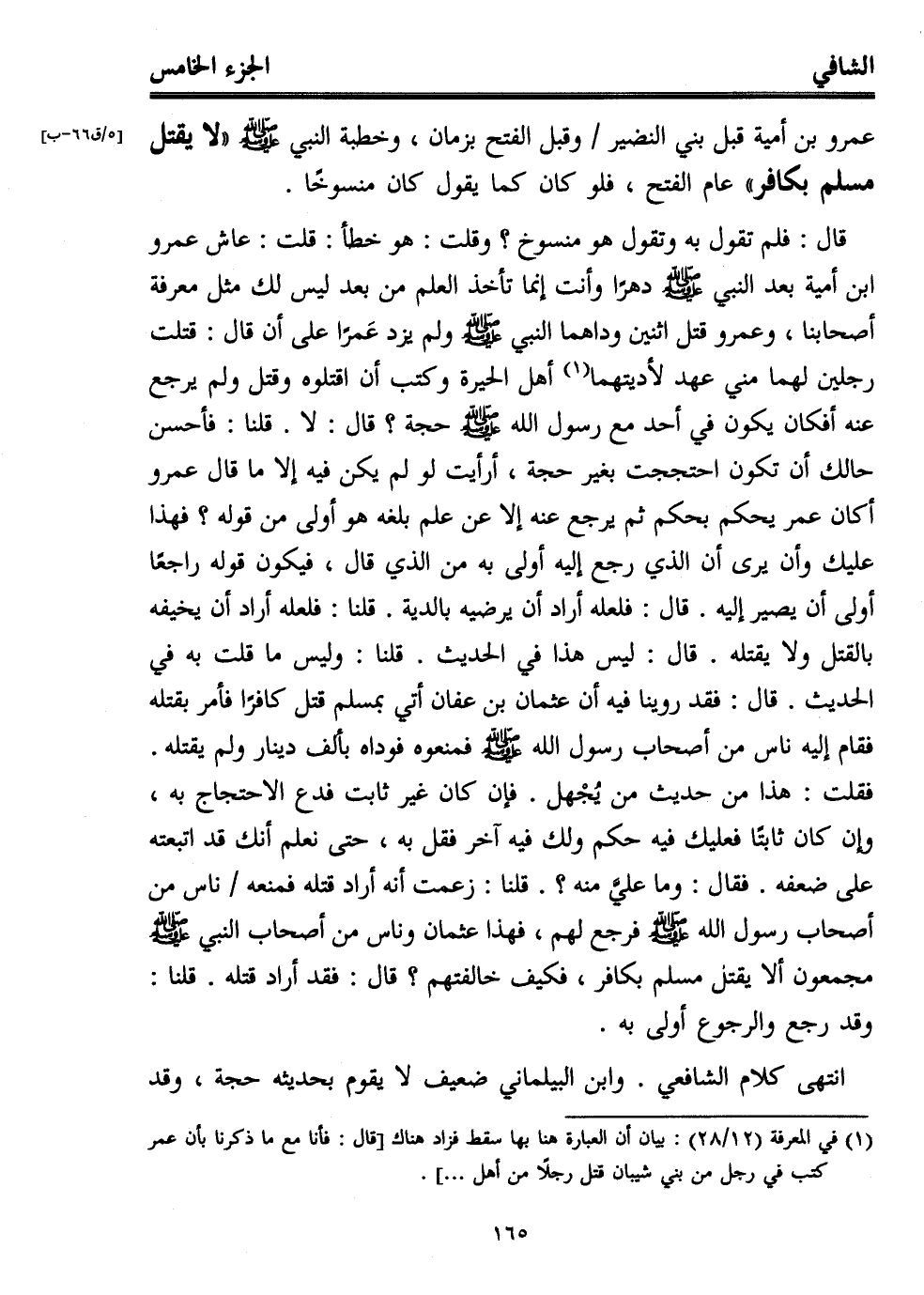 فقلت: هذا من حديث من يُجْهل. فإن كان غير ثابت فدع الاحتجاج به، وإن كان ثابتًا فعليك فيه حكم ولك فيه آخر فقل به، حتى نعلم أنك قد اتبعته على ضعفه. فقال: وما عليَّ منه؟. قلنا: زعمت أنه أراد قتله فمنعه ناس من أصحاب رسول الله - صلى الله عليه وسلم - فرجع لهم، فهذا عثمان وناس من أصحاب النبي - صلى الله عليه وسلم - مجمعون ألا يقتل مسلم بكافر، فكيف خالفتهم؟ قال: فقد أراد قتله. قلنا: وقد رجع والرجوع أولى به.