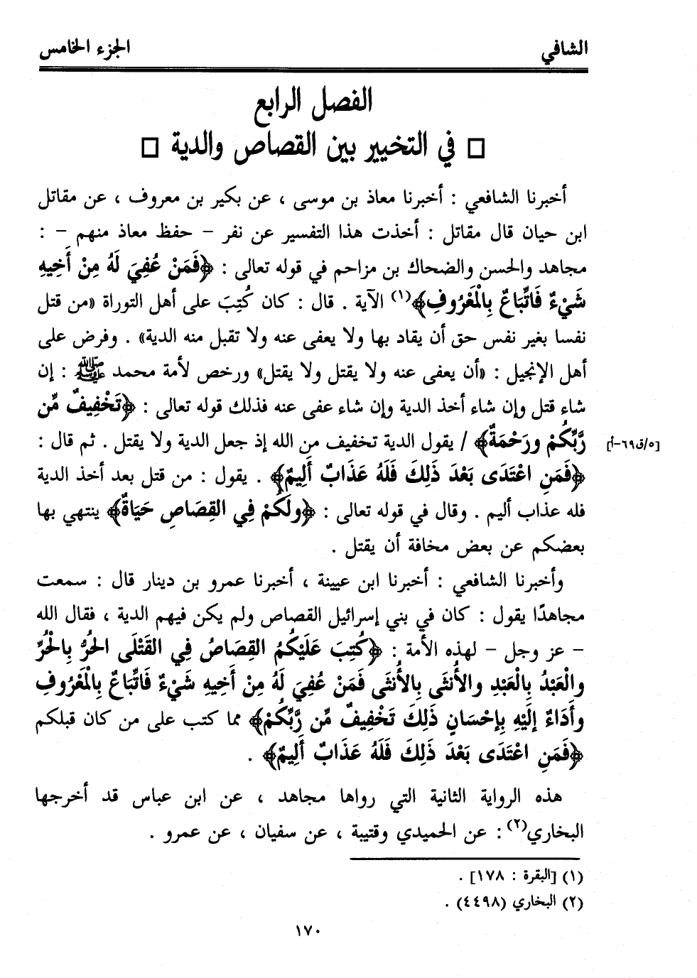 وأخبرنا الشافعي: أخبرنا ابن عيينة، أخبرنا عمرو بن دينار قال: سمعت مجاهدًا يقول: كان في بني إسرائيل القصاص ولم يكن فيهم الدية، فقال الله -عز وجل- لهذه الأمة: {كُتِبَ عَلَيْكُمُ الْقِصَاصُ في الْقَتْلَى الْحُرُّ بِالْحُرِّ وَالْعَبْدُ بِالْعَبْدِ وَالْأُنْثَى بِالْأُنْثَى فَمَنْ عُفِيَ لَهُ مِنْ أَخِيهِ شَيْءٌ فَاتِّبَاعٌ بِالْمَعْرُوفِ وَأَدَاءٌ إِلَيْهِ بِإِحْسَانٍ ذَلِكَ تَخْفِيفٌ مِنْ رَبِّكُمْ} مما كتب على من كان قبلكم {فَمَنِ اعْتَدَى بَعْدَ ذَلِكَ فَلَهُ عَذَابٌ أَلِيمٌ}.