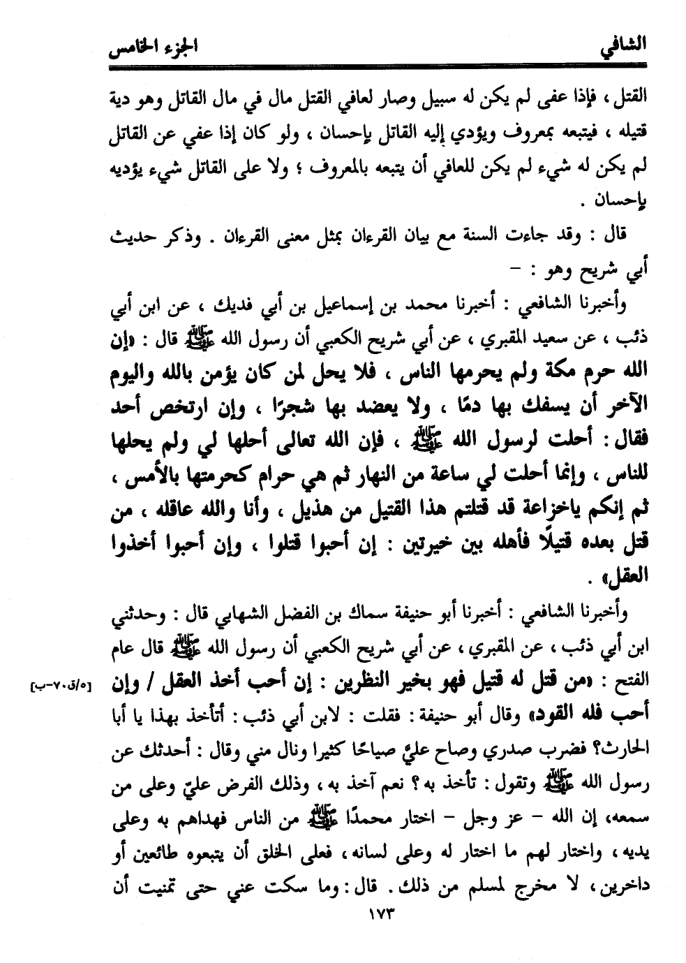 وأخبرنا الشافعي: أخبرنا محمد بن إسماعيل بن أبي فديك، عن ابن أبي ذئب، عن سعيد المقبري، عن أبي شريح الكعبي أن رسول الله - صلى الله عليه وسلم - قال: "إن الله حرم مكة ولم يحرمها الناس، فلا يحل لمن كان يؤمن بالله واليوم الآخر أن يسفك بها دمًا. ولا يعضد بها شجرًا، وإن ارتخص أحد فقال: أحلت لرسول الله - صلى الله عليه وسلم -، فإن الله تعالى أحلها لي ولم يحلها للناس، وإنما أحلت لي ساعة من النهار ثم هي حرام كحرمتها بالأمس، ثم إنكم ياخزاعة قد قتلتم هذا القتيل من هذيل، وأنا والله عاقله، من قتل بعده قتيلاً فأهله بين خيرتين: إن أحبوا قتلوا، وإن أحبوا أخذوا العقل".