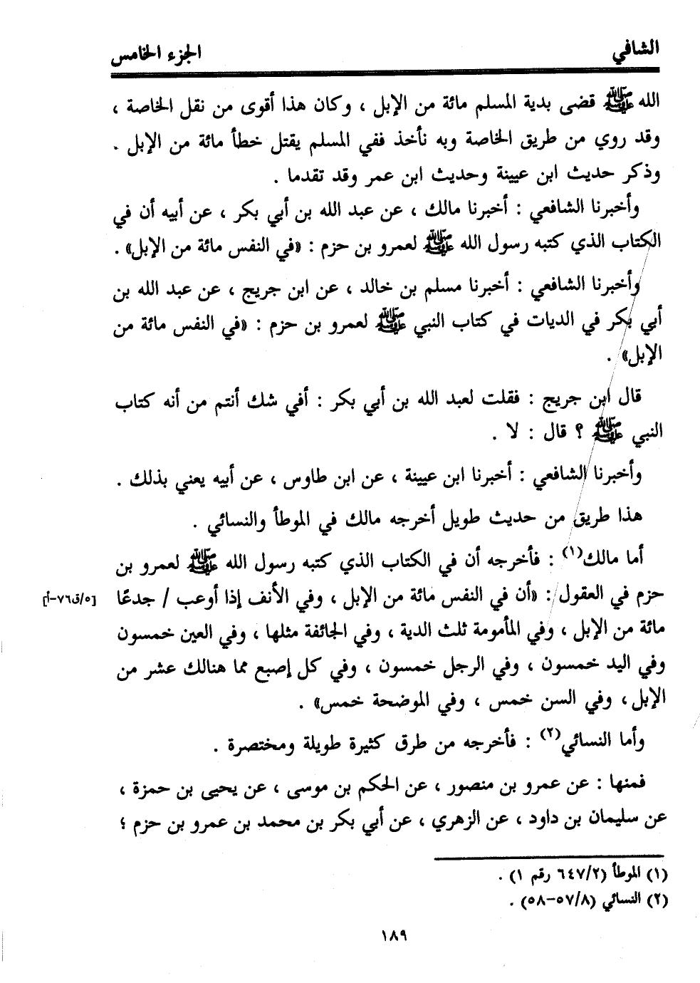 وأخبرنا الشافعي: أخبرنا مسلم بن خالد، عن ابن جريج، عن عبد الله بن أبي بكر في الديات في كتاب النبي - صلى الله عليه وسلم - لعمرو بن حزم: "في النفس مائة من الإبل".