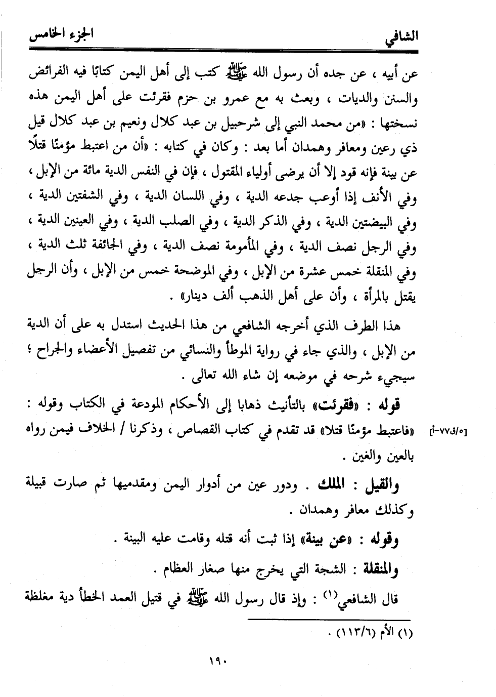 هذا الطرف الذي أخرجه الشافعي من هذا الحديث استدل به على أن الدية من الإبل، والذي جاء في رواية الموطأ والنسائي من تفصيل الأعضاء والجراح؛ سيجيء شرحه في موضعه إن شاء الله تعالى.