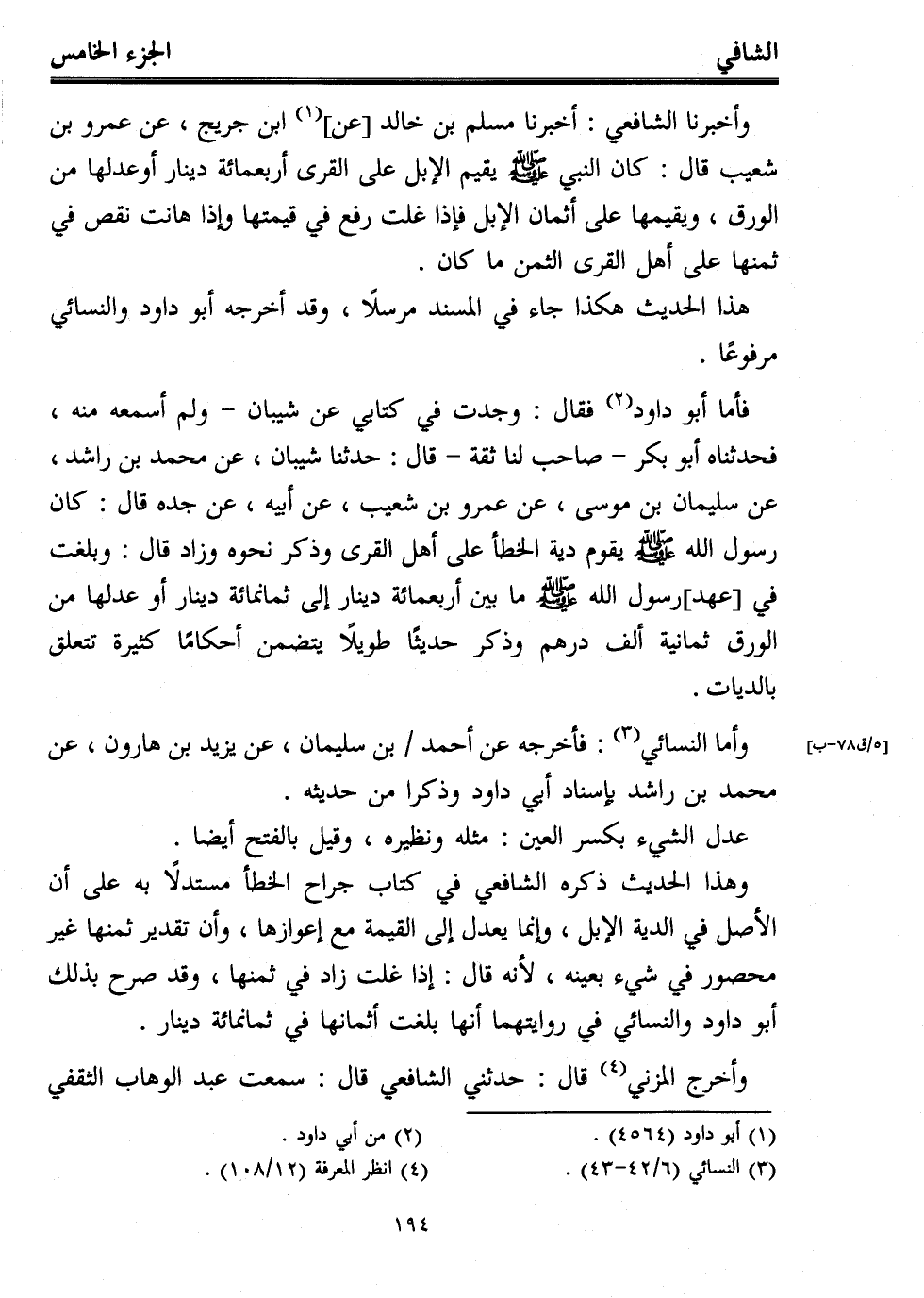 وهذا الحديث ذكره الشافعي في كتاب جراح الخطأ مستدلاً به على أن الأصل في الدية الإبل، وإنما يعدل إلى القيمة مع إعوازها، وأن تقدير ثمنها غير محصور في شيء بعينه، لأنه قال: إذا غلت زاد في ثمنها، وقد صرح بذلك أبو داود والنسائي في روايتهما أنها بلغت أثمانها في ثمانمائة دينار.
