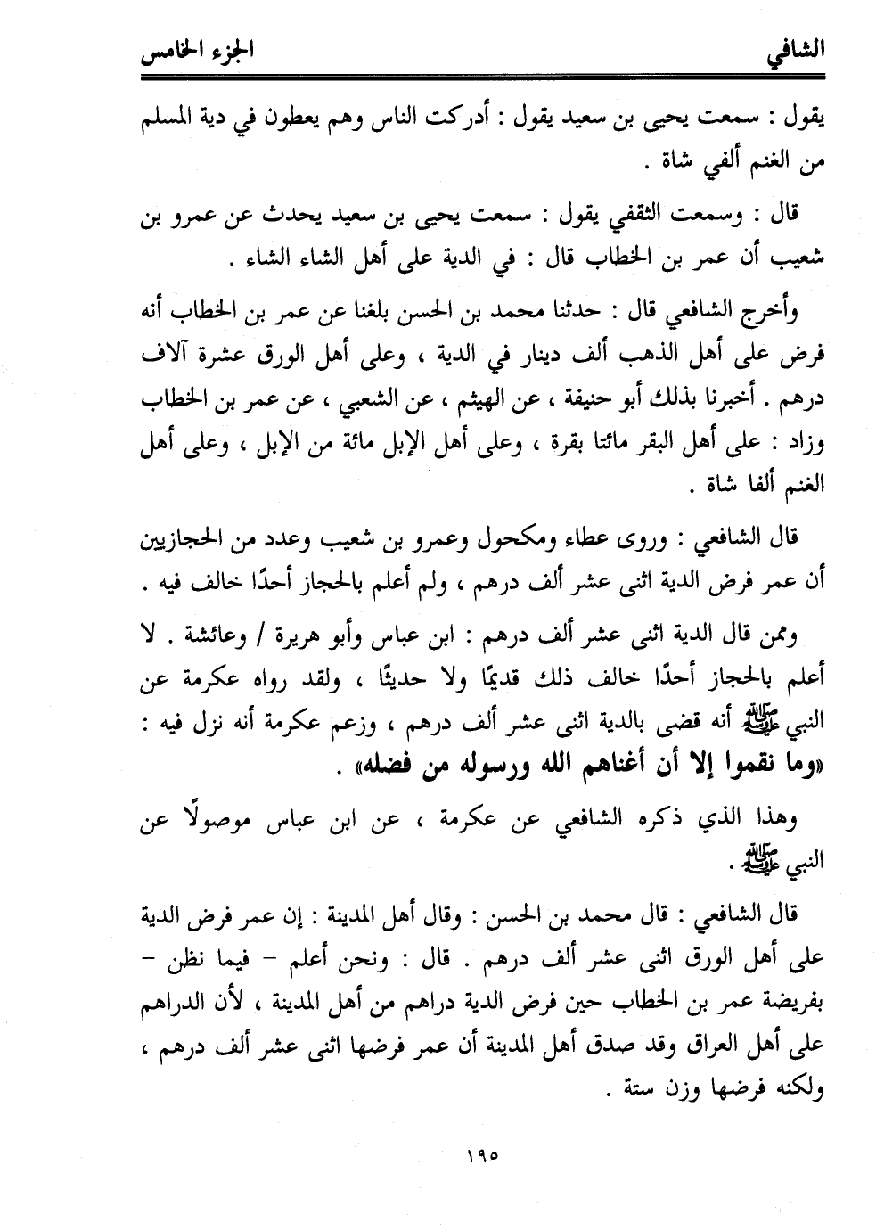 وممن قال الدية اثنى عشر ألف درهم: ابن عباس وأبو هريرة وعائشة. لا أعلم بالحجاز أحدًا خالف ذلك قديمًا ولا حديثًا, ولقد رواه عكرمة عن النبي - صلى الله عليه وسلم - أنه قضى بالدية اثنى عشر ألف درهم، وزعم عكرمة أنه نزل فيه: "وما نقموا إلا أن أغناهم الله ورسوله من فضله".