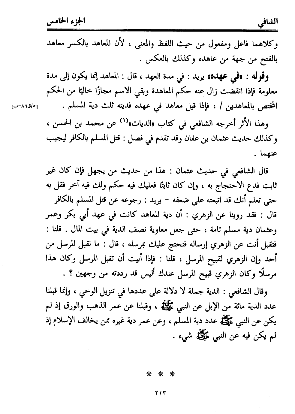 قال الشافعي في حديث عثمان: هذا من حديث من يجهل فإن كان غير ثابت فدع الاحتجاج به، وإن كان ثابتًا فعليك فيه حكم ولك فيه آخر فقل به حتى تعلم أنك قد اتبعته على ضعفه -يريد: رجوعه عن قتل المسلم بالكافر- قال: فقد روينا عن الزهري: أن دية المعاهد كانت في عهد أبي بكر وعمر وعثمان دية مسلم تامة، حتى جعل معاوية نصف الدية في بيت المال. قلنا: فتقبل أنت عن الزهري إرساله فنحتج عليك بمرسله، قال: ما نقبل المرسل من أحد وإن الزهري لقبيح المرسل، قلنا: فإذا أبيت أن تقبل المرسل وكان هذا مرسلاً وكان الزهري قبيح المرسل عندك أليس قد رددته من وجهين؟.