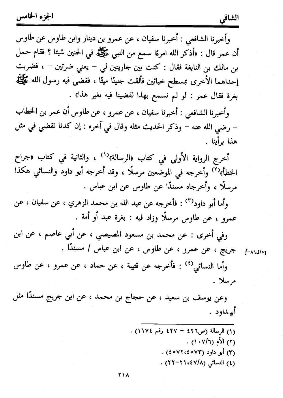 أخرج الرواية الأولى في كتاب "الرسالة" (¬1)، والثانية في كتاب "جراح الخطأ" (¬2) وأخرجه في الموضعين مرسلاً، وقد أخرجه أبو داود والنسائي هكذا مرسلاً، وأخرجاه مسندًا عن طاوس عن ابن عباس.