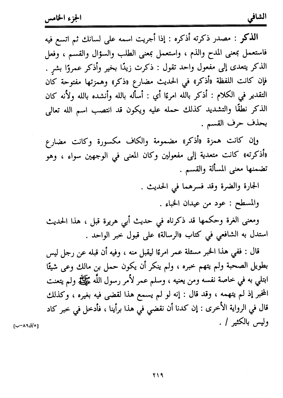 الذكر: مصدر ذكرته أذكره: إذا أجريت اسمه على لسانك ثم اتسع فيه فاستعمل بمعنى المدح والذم، واستعمل بمعنى الطلب والسؤال والقسم، وفعل الذكر يتعدى إلى مفعول واحد تقول: ذكرت زيدًا بخير وأذكر عمروًا بشرٍ. فإن كانت اللفظة "أذكر" في الحديث مضارع "ذكر" وهمزتها مفتوحة كان التقدير في الكلام: أذكر بالله امرءًا أي: أسأله بالله وأنشده بالله ولأنه كان الذكر نطقًا والتشديد كذلك حمله عليه ويكون قد انتصب اسم الله تعالى بحذف حرف القسم.