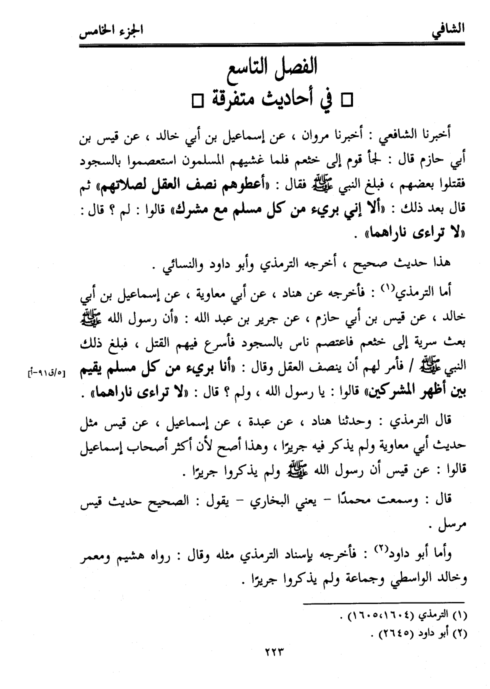أما الترمذي (¬1): فأخرجه عن هناد، عن أبي معاوية، عن إسماعيل بن أبي خالد، عن قيس بن أبي حازم، عن جرير بن عبد الله: "أن رسول الله - صلى الله عليه وسلم - بعث سرية إلى خثعم فاعتصم ناس بالسجود فأسرع فيهم القتل، فبلغ ذلك النبي - صلى الله عليه وسلم - فأمر لهم أن ينصف العقل وقال: "أنا بريء من كل مسلم يقيم بين أظهر المشركين" قالوا: يا رسول الله، ولم؟ قال: "لا تراءى ناراهما".
