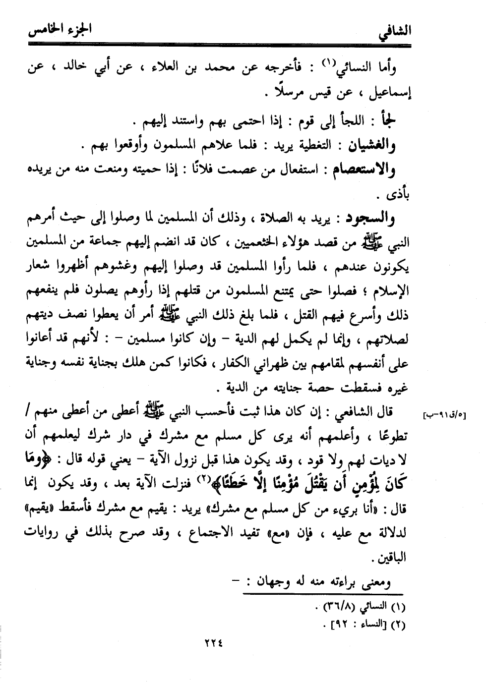 قال الشافعي: إن كان هذا ثبت فأحسب النبي - صلى الله عليه وسلم - أعطى من أعطى منهم تطوعًا، وأعلمهم أنه يرى كل مسلم مع مشرك في دار شرك ليعلمهم أن لا ديات لهم ولا قود، وقد يكون هذا قبل نزول الآية -يعني قوله قال: {وَمَا كَانَ لِمُؤْمِنٍ أَنْ يَقْتُلَ مُؤْمِنًا إِلَّا خَطَئاً} (¬2) فنزلت الآية بعد، وقد يكون إنما قال: "أنا بريء من كل مسلم مع مشرك" يريد: يقيم مع مشرك فأسقط "يقيم" لدلالة مع عليه، فإن "مع" تفيد الاجتماع، وقد صرح بذلك في روايات الباقين.