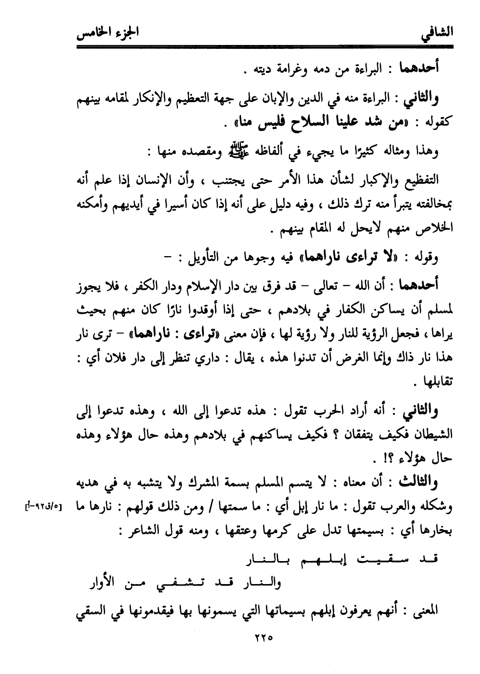 والثالث: أن معناه: لا يتسم المسلم بسمة المشرك ولا يتشبه به في هديه وشكله والعرب تقول: ما نار إبل أي: ما سمتها ومن ذلك قولهم: نارها ما بخارها أي: بسيمتها تدل على كرمها وعتقها، ومنه قول الشاعر: