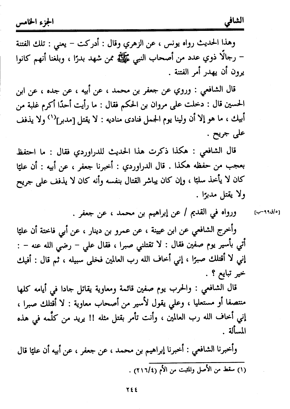 قال الشافعي: وروي عن جعفر بن محمد، عن أبيه، عن جده، عن ابن الحسين قال: دخلت على مروان بن الحكم فقال: ما رأيت أحداً أكرم غلبة من أبيك، ما هو إلا أن ولينا يوم الجمل فنادى مناديه: لا يقتل [مدبر] (¬1) ولا يذفف على جريح.