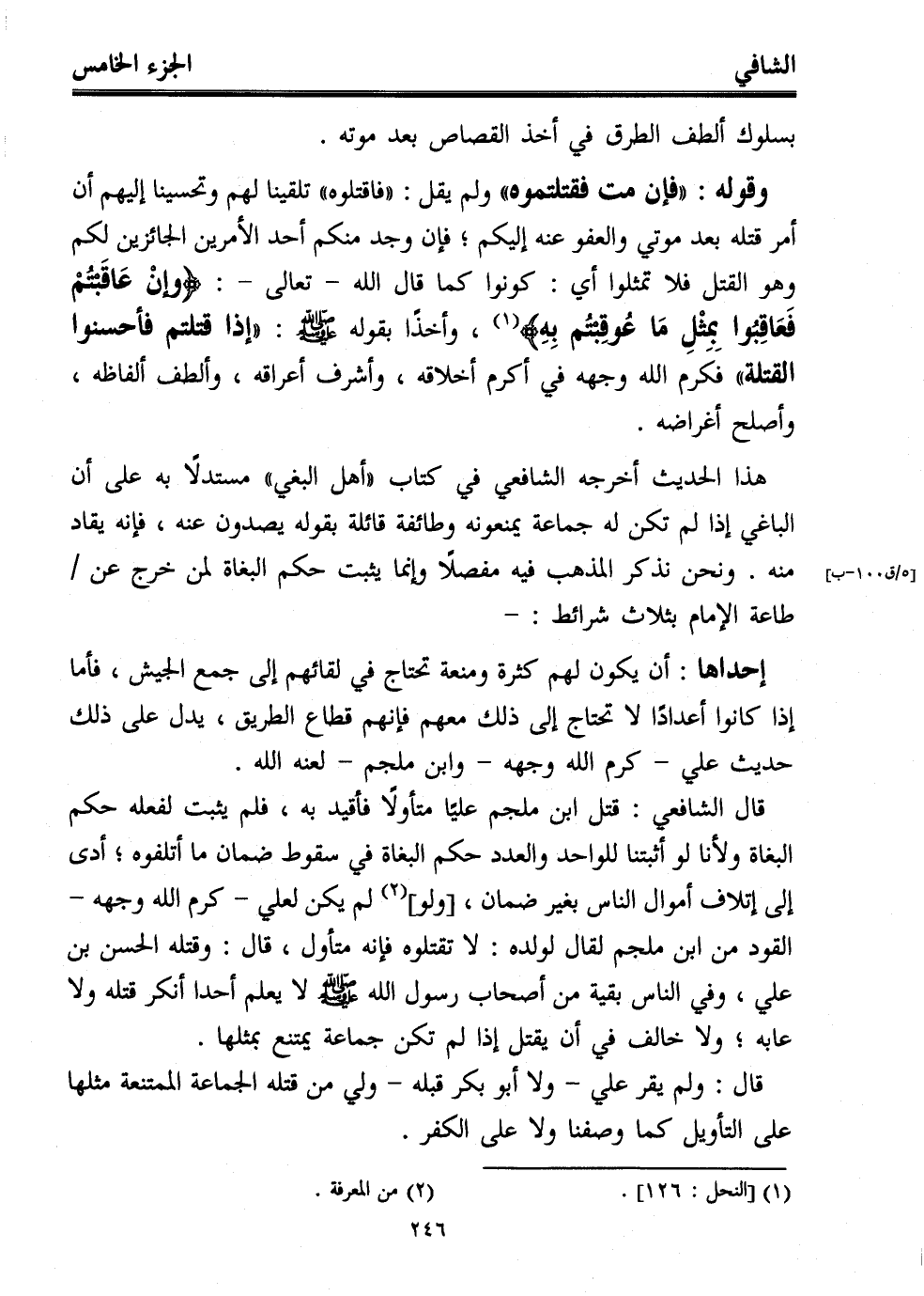 قال الشافعي: قتل ابن ملجم عليًا متأولاً فأقيد به، فلم يثبت لفعله حكم البغاة ولأنا لو أثبتنا للواحد والعدد حكم البغاة في سقوط ضمان ما أتلفوه؛ أدى إلى إتلاف أموال الناس بغير ضمان، [ولو] (¬2) لم يكن لعلي -كرم الله وجهه- القود من ابن ملجم لقال لولده: لا تقتلوه فإنه متأول، قال: وقتله الحسن بن علي، وفي الناس بقية من أصحاب رسول الله - صلى الله عليه وسلم - لا يعلم أحدا أنكر قتله ولا عابه؛ ولا خالف في أن يقتل إذا لم تكن جماعة يمتنع بمثلها.
