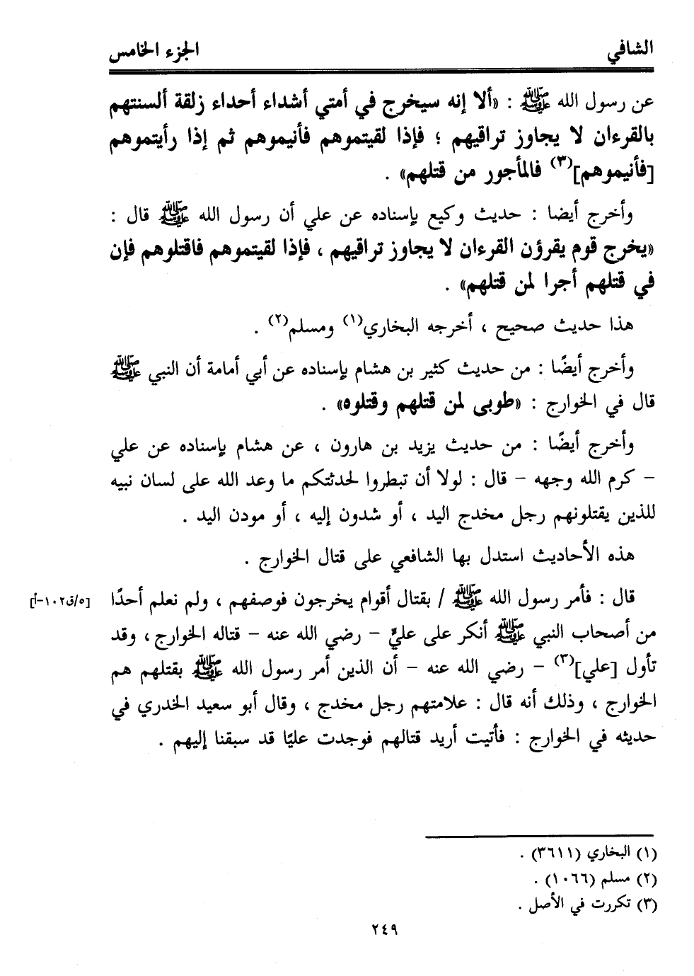 هذه الأحاديث استدل بها الشافعي على قتال الخوارج.