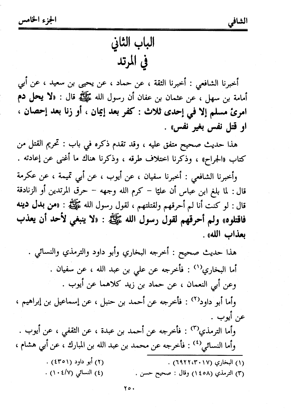 أخبرنا الشافعي: أخبرنا الثقة، عن حماد، عن يحيى بن سعيد، عن أبي أمامة بن سهل، عن عثمان بن عفان أن رسول الله - صلى الله عليه وسلم - قال: "لا يحل دم امرئ مسلم إلا في إحدى ثلاث: كفر بعد إيمان، أو زنا بعد إحصان، أو قتل نفس بغير نفس".