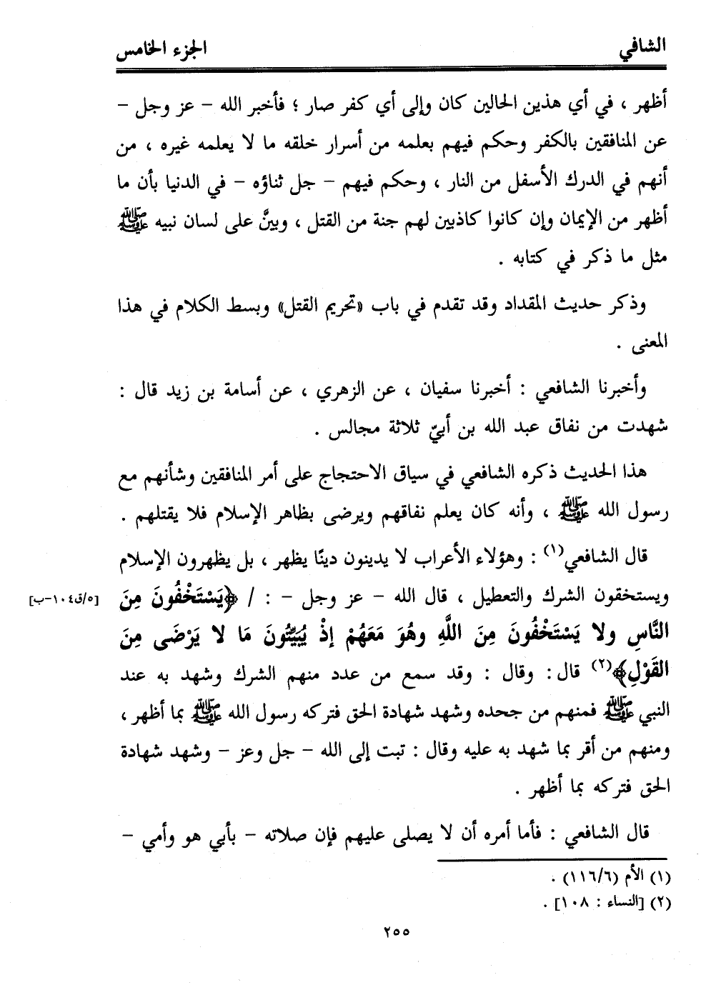 قال الشافعي (¬1): وهؤلاء الأعراب لا يدينون دينًا يظهر، بل يظهرون الإسلام ويستخفون الشرك والتعطيل، قال الله -عز وجل-: {يَسْتَخْفُونَ مِنَ النَّاسِ وَلَا يَسْتَخْفُونَ مِنَ اللهِ وَهُوَ مَعَهُمْ إِذْ يُبَيِّتُونَ مَا لَا يَرْضَى مِنَ الْقَوْلِ} (¬2) قال: وقال: وقد سمع من عدد منهم الشرك وشهد به عند النبي - صلى الله عليه وسلم - فمنهم من جحده وشهد شهادة الحق فتركه رسول الله - صلى الله عليه وسلم - بما أظهر، ومنهم من أقر بما شهد به عليه وقال: تبت إلى الله -جل وعز- وشهد شهادة الحق فتركه بما أظهر.