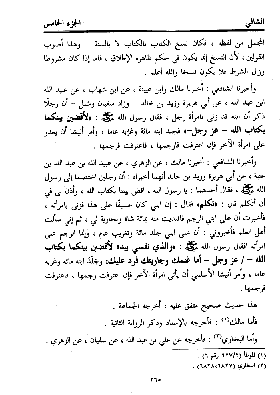 وأخبرنا الشافعي: أخبرنا مالك، عن الزهري، عن عبيد الله بن عبد الله بن عتبة، عن أبي هريرة وزيد بن خالد أنهما أخبراه: أن رجلين اختصما إلى رسول الله - صلى الله عليه وسلم -، فقال أحدهما: يا رسول الله، اقض بيننا بكتاب الله، وأذن لي في أن أتكلم قال: "تكلم" فقال: إن ابني كان عسيفًا على هذا فزنى بامرأته، فأخبرت أن على ابني الرجم فافتديت منه بمائة شاة وبجارية لي، ثم إني سألت أهل العلم فأخبروني: أن على ابني جلد مائة وتغريب عام، وإنما الرجم على امرأته افقال رسول الله - صلى الله عليه وسلم -: "والذي نفسي بيده لأقضين بينكما بكتاب الله-عز وجل- أما غنمك وجاريتك فرد عليك" وجَلَدَ ابنه مائة وغربه عاما، وأمر أنيسًا الأسلمي أن يأتي امرأة الآخر فإن اعترفت رجمها، فاعترفت فرجمها.