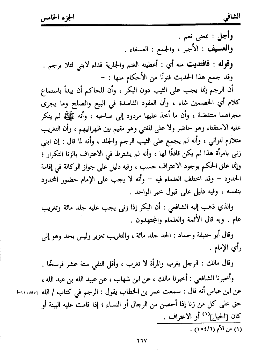 وأخبرنا الشافعي: أخبرنا مالك، عن ابن شهاب، عن عبيد الله بن عبد الله، عن ابن عباس أنه قال: سمعت عمر بن الخطاب يقول: الرجم في كتاب الله حق على كل من زنا إذا أحصن من الرجال أو النساء؛ إذا قامت عليه البينة أو كان [الحبل] (¬1) أو الاعتراف.