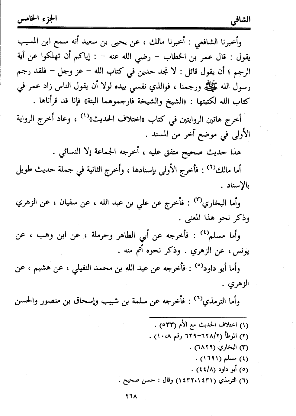 وأخبرنا الشافعي: أخبرنا مالك، عن يحيى بن سعيد أنه سمع ابن المسيب يقول: قال عمر بن الخطاب -رضي الله عنه-: إياكم أن تهلكوا عن آية الرجم؛ أن يقول قائل: لا نجد حدين في كتاب الله -عز وجل- فلقد رجم رسول الله - صلى الله عليه وسلم - ورجمنا، فوالذي نفسي بيده لولا أن يقول الناس زاد عمر في كتاب الله لكتبتها: "الشيخ والشيخة فارجموهما البتة" فإنا قد قرأناها.