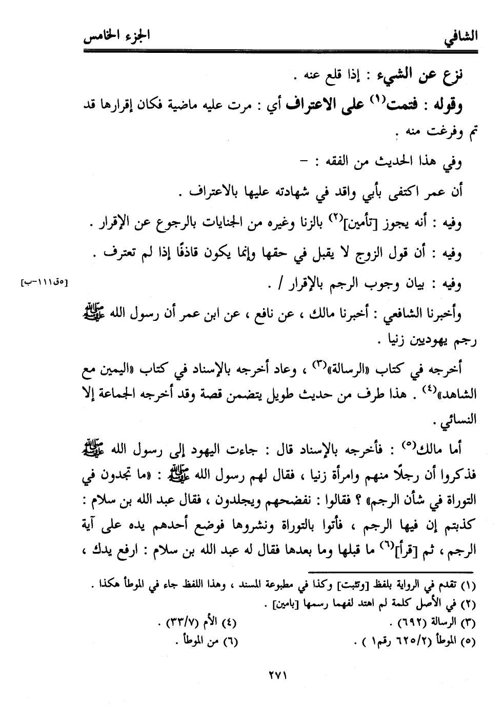 أما مالك (¬5): فأخرجه بالإسناد قال: جاءت اليهود إلى رسول الله - صلى الله عليه وسلم - فذكروا أن رجلاً منهم وامرأة زنيا، فقال لهم رسول الله - صلى الله عليه وسلم -: "ما تجدون في التوراة في شأن الرجم"؟ فقالوا: نفضحهم ويجلدون، فقال عبد الله بن سلام: كذبتم إن فيها الرجم، فأتوا بالتوراة ونشروها فوضع أحدهم يده على آية الرجم، ثم [قرأ] (¬6) ما قبلها وما بعدها فقال له عبد الله بن سلام: ارفع يدك،