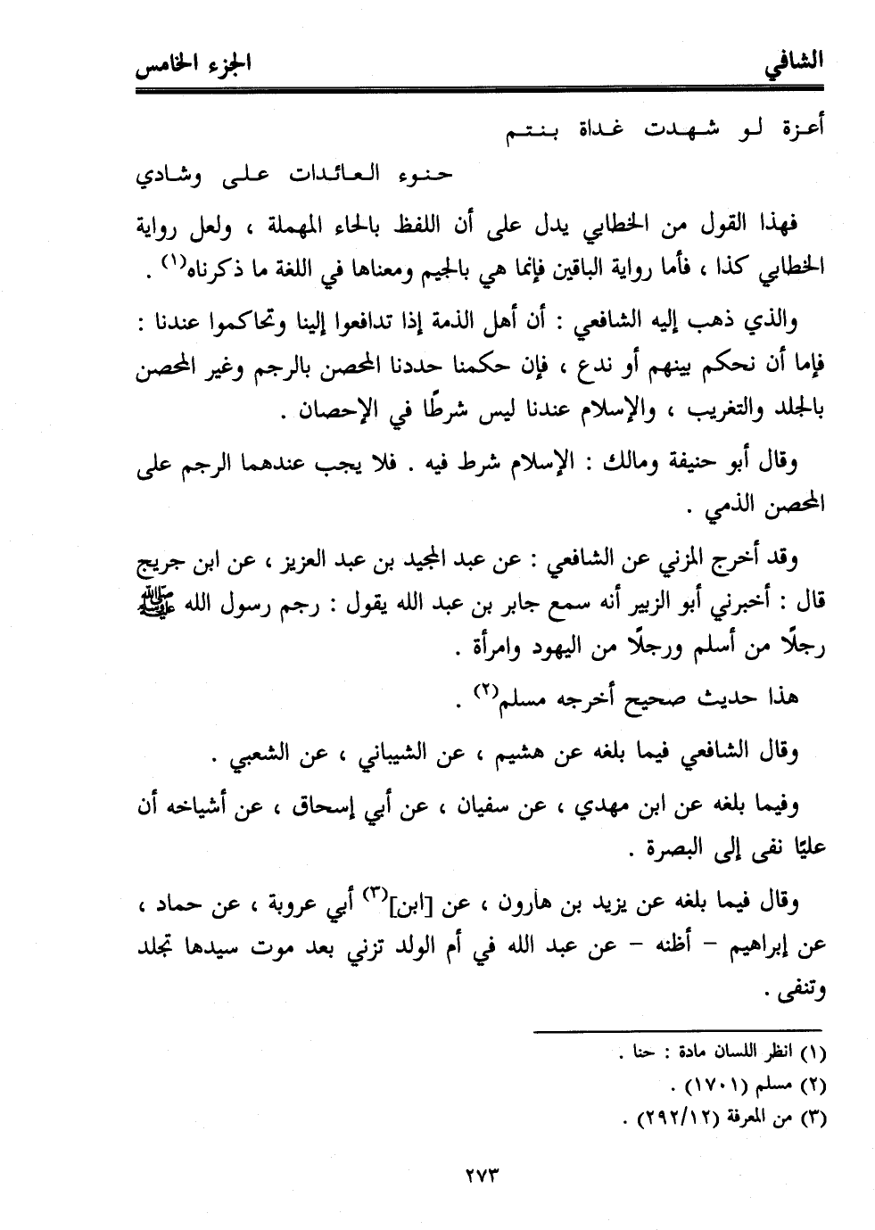 وقد أخرج المزني عن الشافعي: عن عبد المجيد بن عبد العزيز، عن ابن جريج قال: أخبرني أبو الزبير أنه سمع جابر بن عبد الله يقول: رجم رسول الله - صلى الله عليه وسلم - رجلاً من أسلم ورجلاً من اليهود وامرأة.