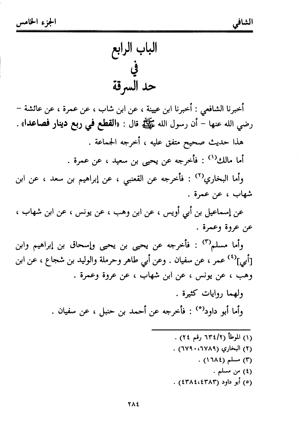 أخبرنا الشافعي: أخبرنا ابن عيينة، عن ابن شهاب، عن عمرة، عن عائشة -رضي الله عنها- أن رسول الله - صلى الله عليه وسلم - قال: "القطع في ربع دينار فصاعدا".