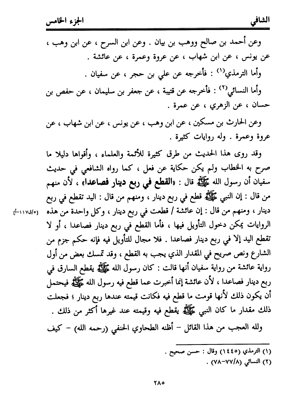 وقد روى هذا الحديث من طرق كثيرة للأئمة والعلماء، وأقواها دليلاً ما صرح به الخطاب ولم يكن حكاية عن فعل، كما رواه الشافعي في حديث سفيان أن رسول الله - صلى الله عليه وسلم - قال: "القطع في ربع دينار فصاعدا"، لأن منهم من قال: إن النبي - صلى الله عليه وسلم - قطع في ربع دينار، ومنهم من قال: اليد تقطع في ربع دينار، ومنهم من قال: إن عائشة قطعت في ربع دينار، وكل واحدة من هذه الروايات يمكن دخول التأويل فيها، فأما القطع في ربع دينار فصاعدا، أو لا تقطع اليد إلا في ربع دينار فصاعدا. فلا مجال للتأويل فيه فإنه حكم جزم من الشارع ونص صريح في المقدار الذي يجب به القطع، وقد تمسك بعض من أول رواية عائشة من رواية سفيان أنها قالت: كان رسول الله - صلى الله عليه وسلم - يقطع السارق في ربع دينار فصاعدا، لأن عائشة إنما أخبرت عما قطع فيه رسول الله - صلى الله عليه وسلم - فيحتمل أن يكون ذلك لأنها قومت ما قطع فيه فكانت قيمته عندها ربع دينار؛ فجعلت ذلك مقدار ما كان النبي - صلى الله عليه وسلم - يقطع فيه وقيمته عند غيرها أكثر من ذلك.