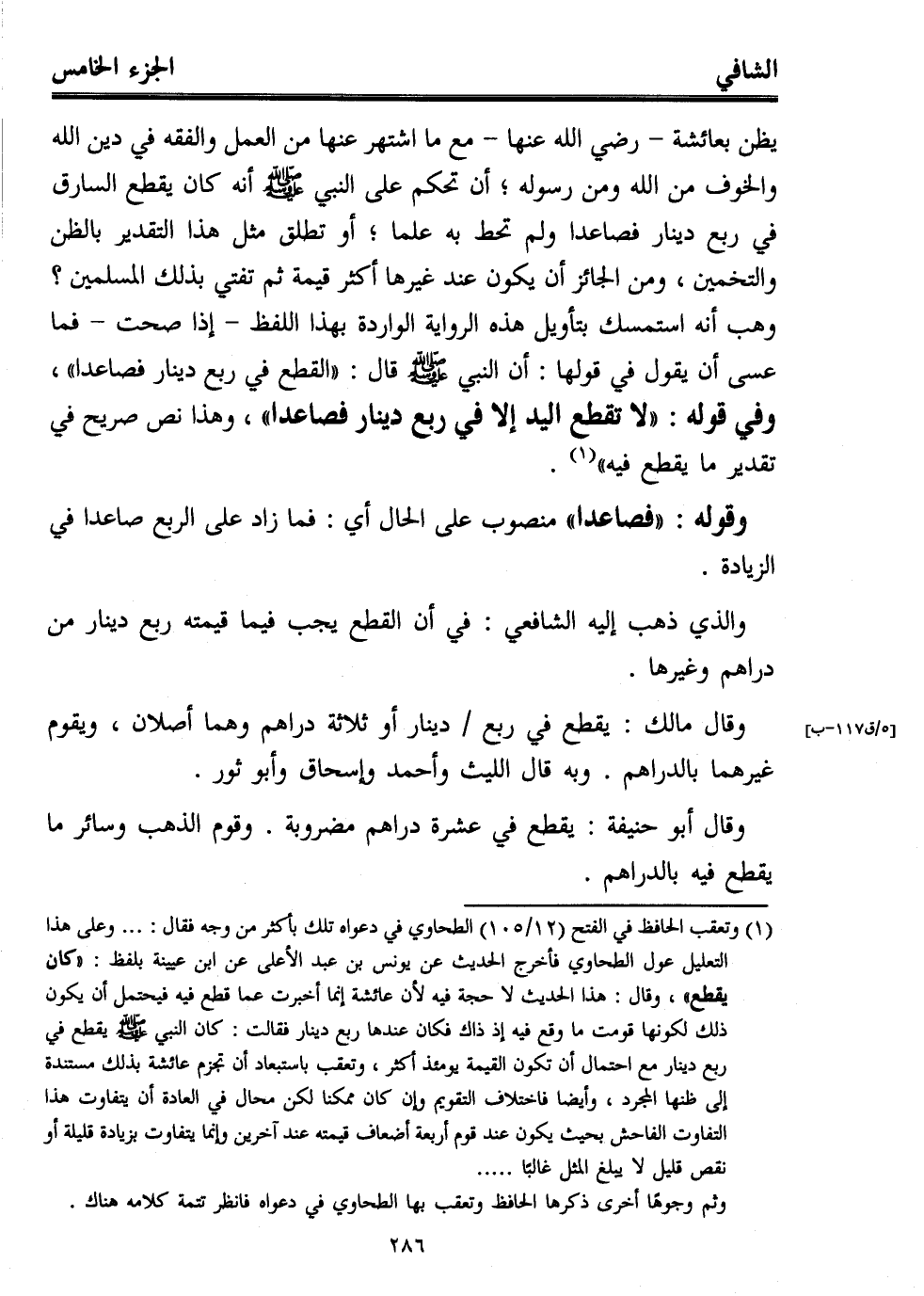 (¬1) وتعقب الحافظ في الفتح (12/ 105) الطحاوي في دعواه تلك بأكثر من وجه فقال: ... وعلى هذا التعليل عول الطحاوي فأخرج الحديث عن يونس بن عبد الأعلى عن ابن عيينة بلفظ: "كان يقطع"، وقال: هذا الحديث لا حجة فيه لأن عائشة إنما أخبرت عما قطع فيه فيحتمل أن يكون ذلك لكونها قومت ما وقع فيه إذ ذاك فكان عندها ربع دينار فقالت: كان النبي - صلى الله عليه وسلم - يقطع في ربع دينار مع احتمال أن تكون القيمة يومئذ أكثر، وتعقب باستبعاد أن تجزم عائشة بذلك مستندة إلى ظنها المجرد، وأيضاً فاختلاف التقويم وإن كان ممكنا لكن محال في العادة أن يتفاوت هذا التفاوت الفاحش بحيث يكون عند قوم أربعة أضعاف قيمته عند آخرين وإنما يتفاوت بزيادة قليلة أو نقص قليل لا يبلغ المثل غالبًا .....