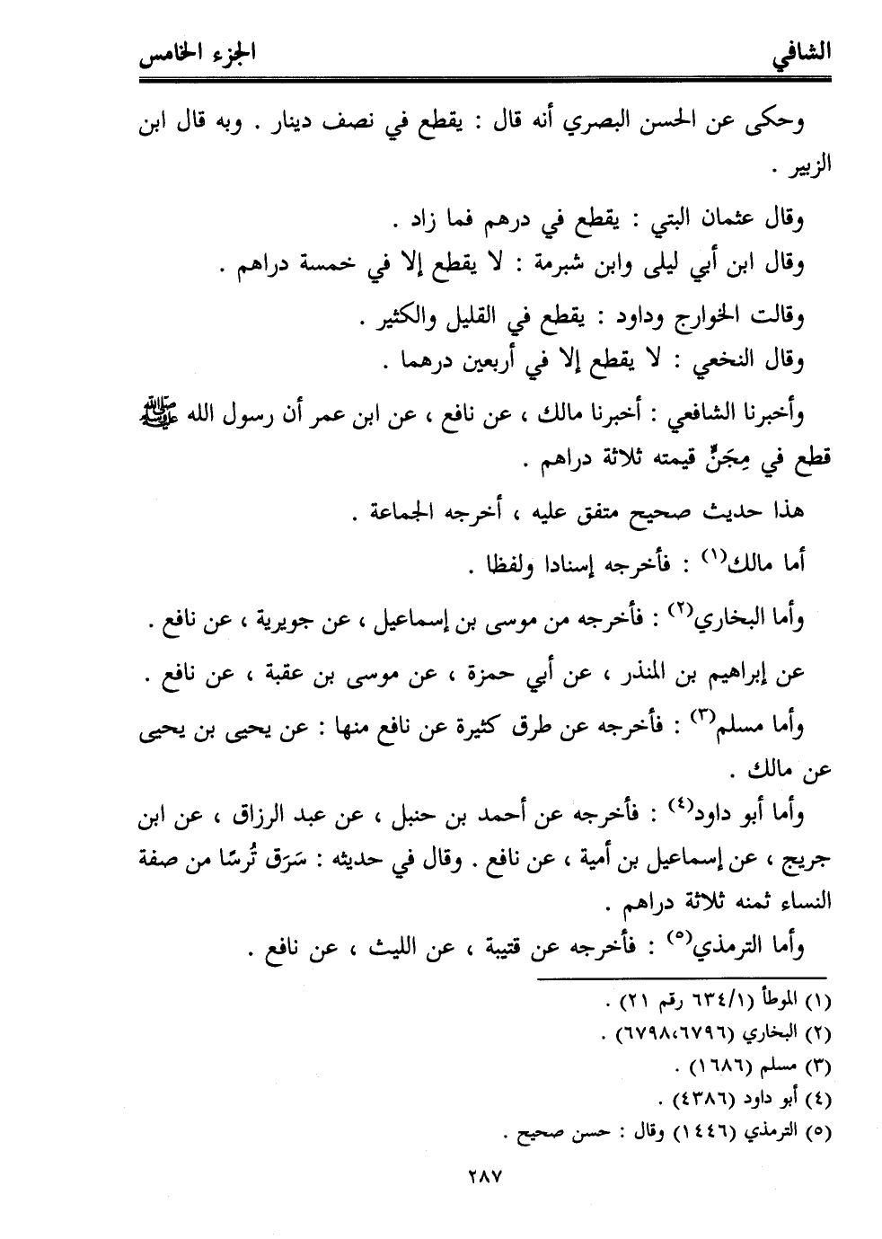 وأخبرنا الشافعي: أخبرنا مالك، عن نافع، عن ابن عمر أن رسول الله - صلى الله عليه وسلم - قطع في مِجَنٍّ قيمته ثلاثة دراهم.