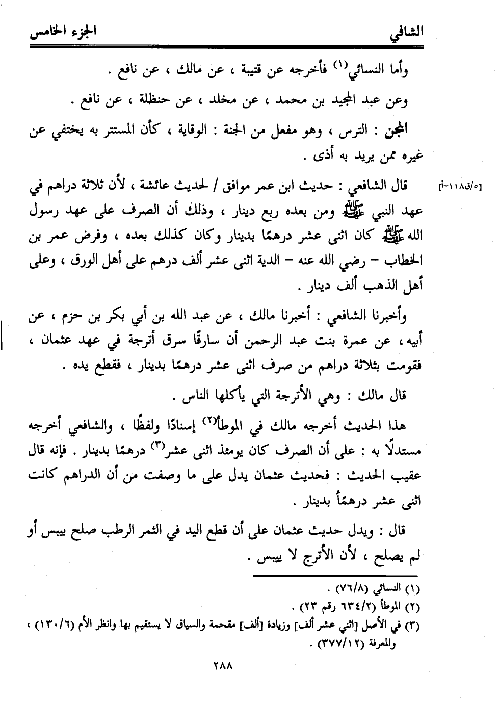 قال الشافعي: حديث ابن عمر موافق لحديث عائشة، لأن ثلاثة دراهم في عهد النبي - صلى الله عليه وسلم - ومن بعده ربع دينار، وذلك أن الصرف على عهد رسول الله - صلى الله عليه وسلم - كان اثنى عشر درهمًا بدينار وكان كذلك بعده، وفرض عمر بن الخطاب -رضي الله عنه- الدية اثنى عشر ألف درهم على أهل الورق، وعلى أهل الذهب ألف دينار.