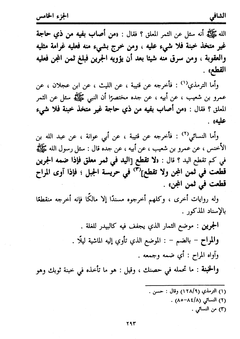 الله - صلى الله عليه وسلم - أنه سئل عن الثمر المعلق؟ فقال: "من أصاب بفيه من ذي حاجة غير متخذ خبنة فلا شيء عليه، ومن خرج بشيء منه فعليه غرامة مثليه والعقوبة، ومن سرق منه شيئًا بعد أن يؤويه الجرين فبلغ ثمن المجن فعليه القطع".