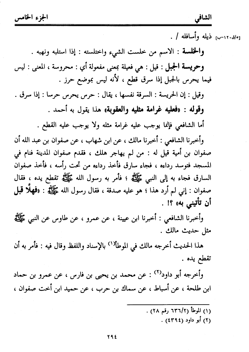 وأخبرنا الشافعي: أخبرنا مالك، عن ابن شهاب، عن صفوان بن عبد الله أن صفوان بن أمية قيل له: من لم يهاجر هلك، فقدم صفوان المدينة فنام في المسجد فتوسد رداءه، فجاء سارق فأخذ رداءه من تحت رأسه، فأخذ صفوان السارق فجاء به إلى النبي - صلى الله عليه وسلم -؛ فأمر به رسول الله - صلى الله عليه وسلم - تقطع يده، فقال صفوان: إني لم أرد هذا؛ هو عليه صدقة، فقال رسول الله - صلى الله عليه وسلم -: "فهلَّا قبل أن تأتيني به"؟!.
