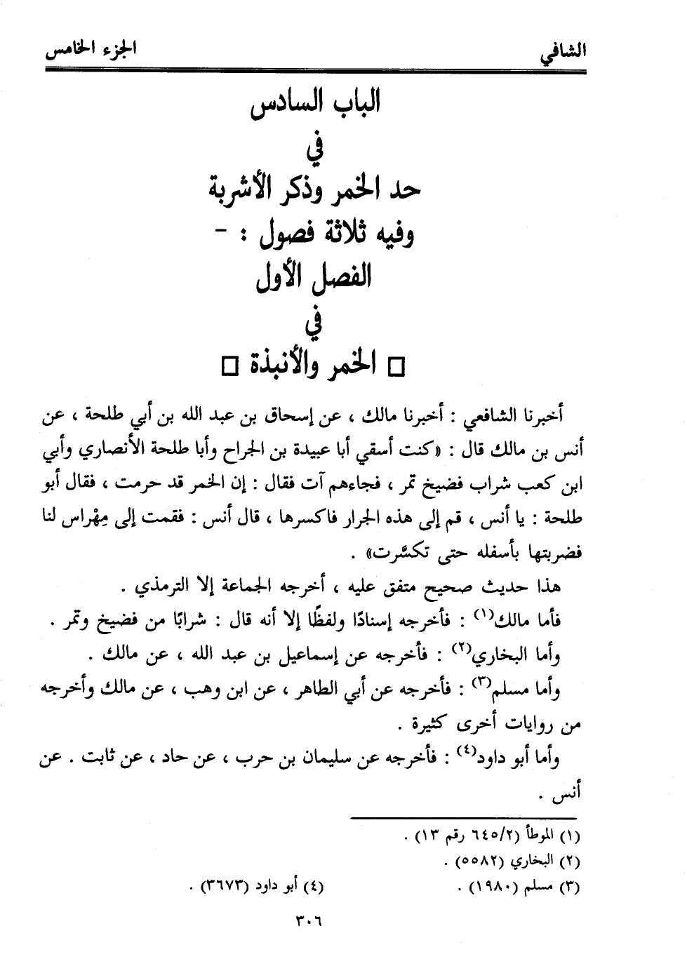 أخبرنا الشافعي: أخبرنا مالك، عن إسحاق بن عبد الله بن أبي طلحة، عن أنس بن مالك قال: "كنت أسقي أبا عبيدة بن الجراح وأبا طلحة الأنصاري وأبي ابن كعب شراب فضيخ تمر، فجاءهم آت فقال: إن الخمر قد حرمت، فقال أبو طلحة: يا أنس، قم إلى هذه الجرار فاكسرها، قال أنس: فقمت إلى مِهْراس لنا فضربتها بأسفله حتى تكسَّرت".