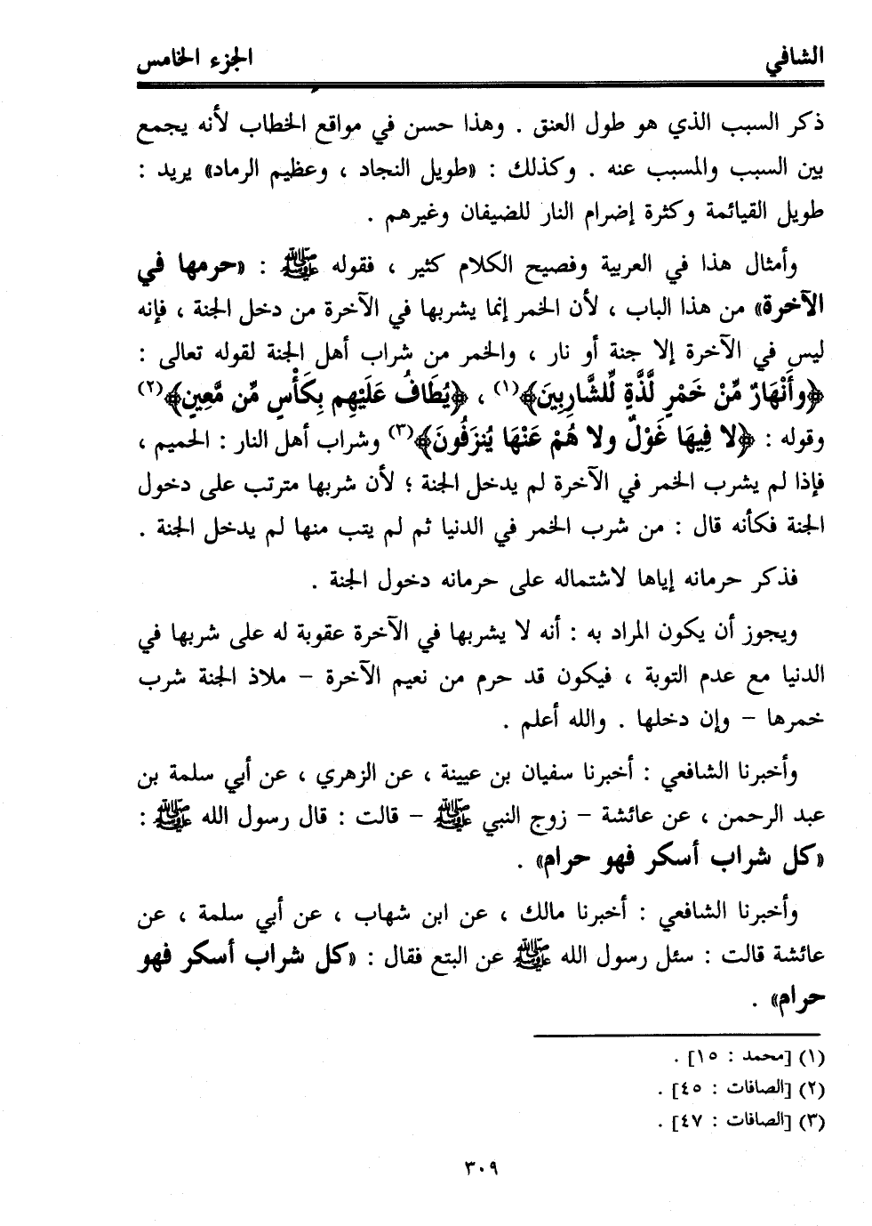 وأخبرنا الشافعي: أخبرنا سفيان بن عيينة، عن الزهري، عن أبي سلمة بن عبد الرحمن، عن عائشة -زوج النبي - صلى الله عليه وسلم- قالت: قال رسول الله - صلى الله عليه وسلم -: "كل شراب أسكر فهو حرام".