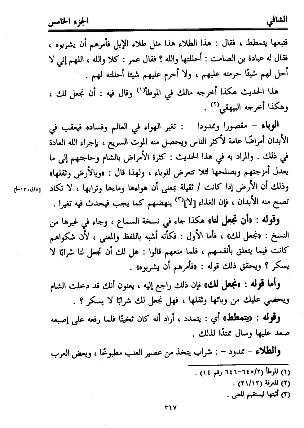 فتبعها يتمطط، فقال: هذا الطلاء هذا مثل طلاء الإبل فأمرهم أن يشربوه، فقال له عبادة بن الصامت: أحللتها والله؟ فقال عمر: كلا والله، اللهم إني لا أحل لهم شيئًا حرمته عليهم، ولا أحرم عليهم شيئًا أحللته لهم.