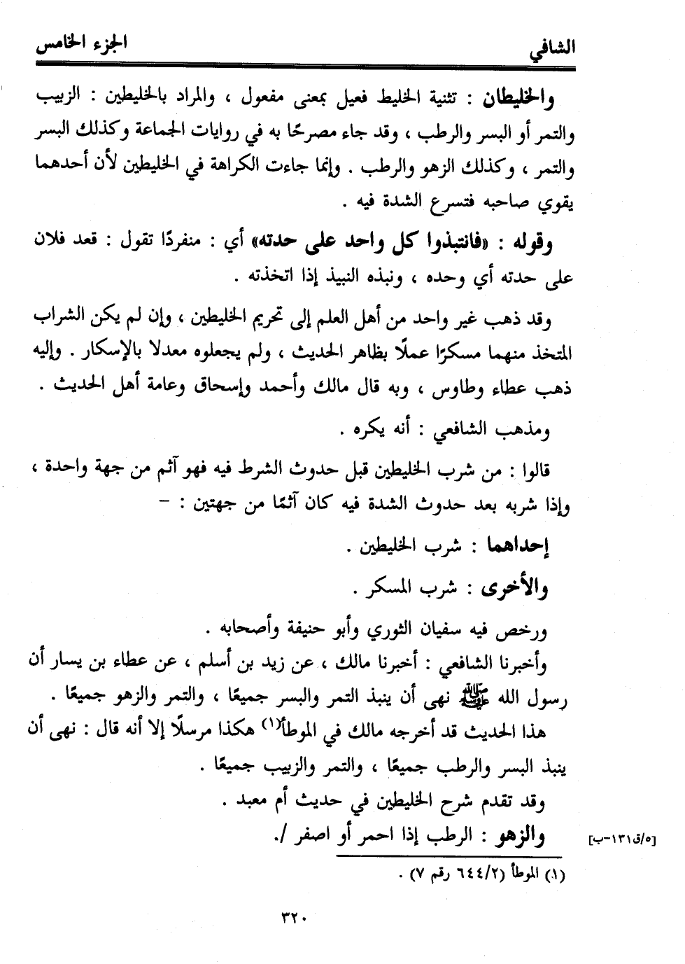 وقد ذهب غير واحد من أهل العلم إلى تحريم الخليطين، وإن لم يكن الشراب المتخذ منهما مسكرًا عملًا بظاهر الحديث، ولم يجعلوه معدلا بالإسكار. وإليه ذهب عطاء وطاوس، وبه قال مالك وأحمد وإسحاق وعامة أهل الحديث.