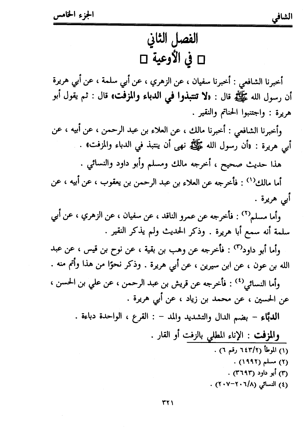 وأخبرنا الشافعي: أخبرنا مالك، عن العلاء بن عبد الرحمن، عن أبيه، عن أبي هريرة: "أن رسول الله - صلى الله عليه وسلم - نهى أن ينتبذ في الدباء والمزفت".