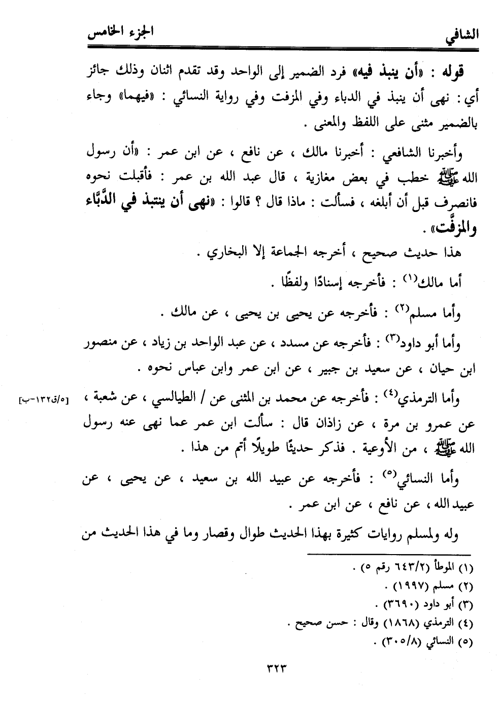وأخبرنا الشافعي: أخبرنا مالك، عن نافع، عن ابن عمر: "أن رسول الله - صلى الله عليه وسلم - خطب في بعض مغازية، قال عبد الله بن عمر: فأقبلت نحوه فانصرف قبل أن أبلغه، فسألت: ماذا قال؟ قالوا: "نهى أن ينتبذ في الدَّبَّاء والمزفَّت".
