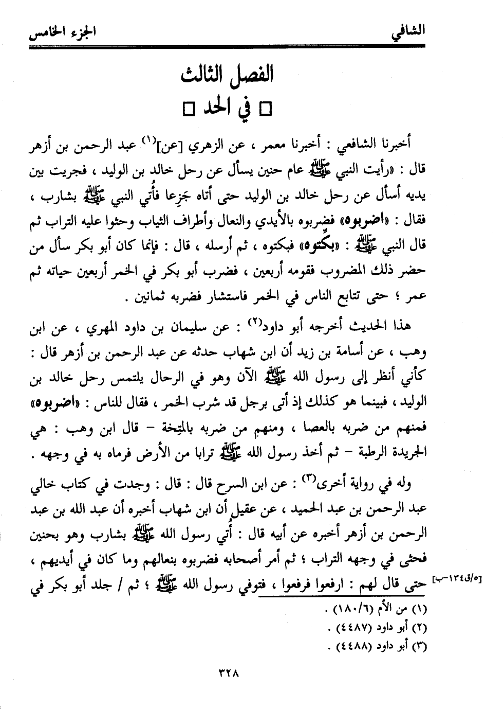 وله في رواية أخرى (¬3): عن ابن السرح قال: قال: وجدت في كتاب خالي عبد الرحمن بن عبد الحميد، عن عقيل أن ابن شهاب أخبره أن عبد الله بن عبد الرحمن بن أزهر أخبره عن أبيه قال: أُتي رسول الله - صلى الله عليه وسلم - بشارب وهو بحنين فحثى في وجهه التراب؛ ثم أمر أصحابه فضربوه بنعالهم وما كان في أيديهم، حتى قال لهم: ارفعوا فرفعوا، فتوفي رسول الله - صلى الله عليه وسلم - ثم جلد أبو بكر في
