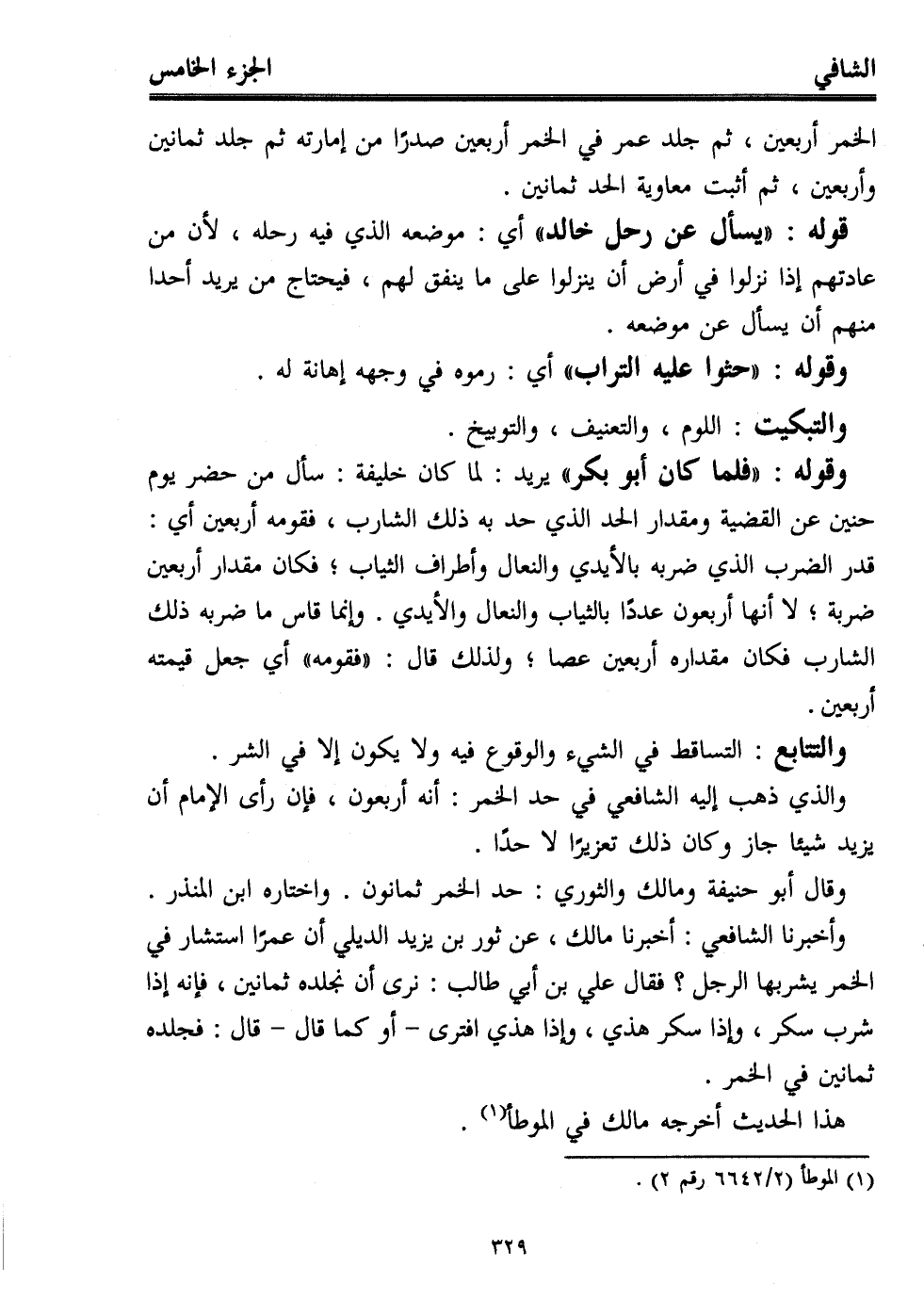 وأخبرنا الشافعي: أخبرنا مالك، عن ثور بن يزيد الديلي أن عمرًا استشار في الخمر يشربها الرجل؟ فقال علي بن أبي طالب: نرى أن نجلده ثمانين، فإنه إذا شرب سكر، وإذا سكر هذي، وإذا هذي افترى -أو كما قال- قال: فجلده ثمانين في الخمر.